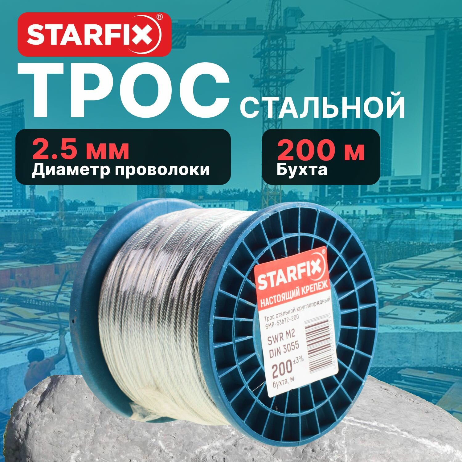 Трос стальной круглопрядный SWR М2.5 DIN 3055 STARFIX бухта 200 м SMP-53695-200 - это высококачественный продукт, который предназначен для широкого спектра применений.
