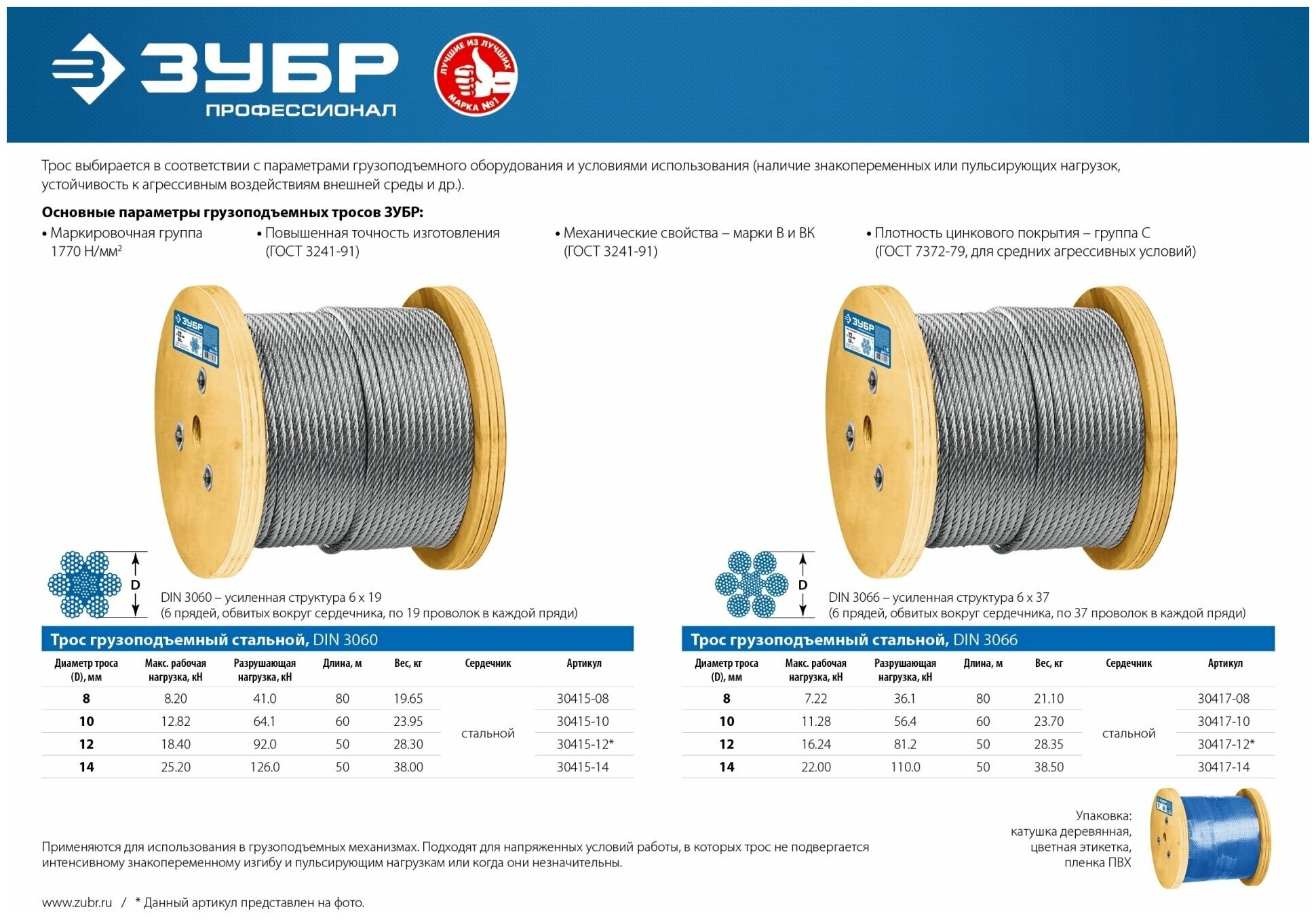 Грузоподъемные тросы изготовлены из оцинкованной проволоки по стандарту DIN 3060. Имеют усиленную структуру 6х19 (6 прядей, обвитых вокруг сердечника, по 19 проволок в каждой пряди). Применяются для подъема грузов при соблюдении определенных условий эксплуатации. Тросы различаются по диаметру и типу поперечного сечения.