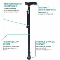 Особенности трости включают телескопическую конструкцию, сменные опорные насадки из прочной износостойкой нескользящей резины и ремешок на кисть.
