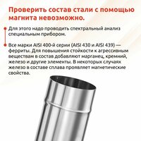 1. Произведена из марки нержавеющей стали AISI 430. Данная сталь устойчива к атмосферной коррозии, а также к атмосферным осадкам. Сталь является жаростойкой и допускается к использованию при температурах до 750°С. Благодаря качественным материалам и конструкции, труба не боится резких перепадов температур, нерегулярной топки, высоких температур.