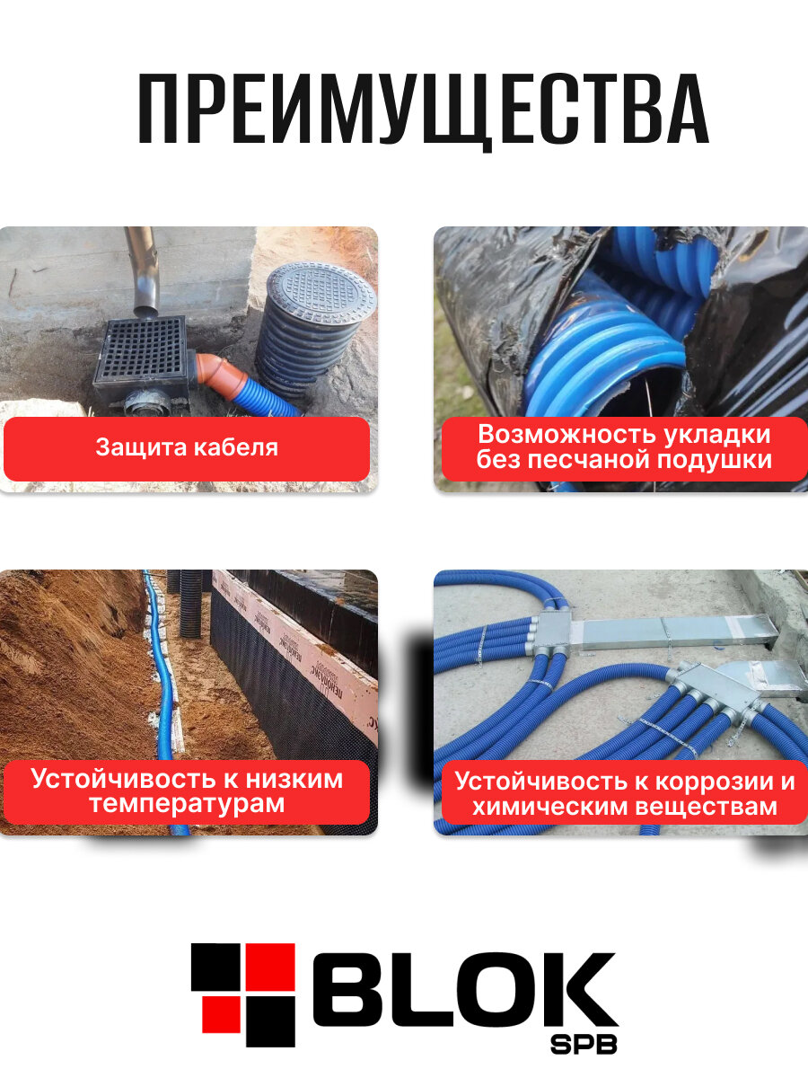Труба изготовлена из полиэтилена, который химически стоек к агрессивным средам. Это обеспечивает длительный срок службы продукта - более 50 лет. Внешняя стенка трубы гофрированная, что обеспечивает высокую прочность труб, а внутренняя стенка гладкая, что облегчает протяжку кабеля.