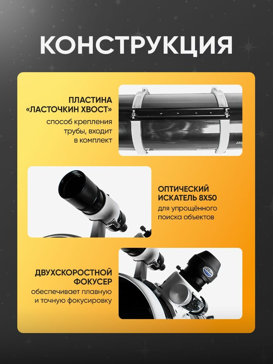 | Дополнительная информация | фокусное расстояние: 1250 мм; максимальное полезное увеличение: x180; способ крепления трубы: штативное гнездо 1/4"; диаметр объектива (апертура): 90 мм; предмет наблюдения: объекты дальнего космоса |