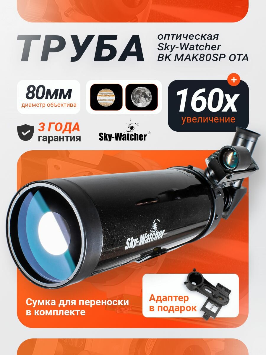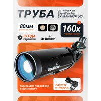 Зеркально-линзовая оптическая труба Sky-Watcher BK MAK80SP OTA одинаково хорошо подходит для наземных наблюдений и для изучения небесных тел: Луны, планет, объектов дальнего космоса. Труба очень легкая и небольшая, так что ее очень удобно брать с собой. На корпусе есть стандартное крепежное гнездо для фотоштатива, так что вам необязательно приобретать монтировку и треногу. Оптическая труба Sky-Watcher BK MAK80SP OTA – прекрасный подарок астролюбителю.