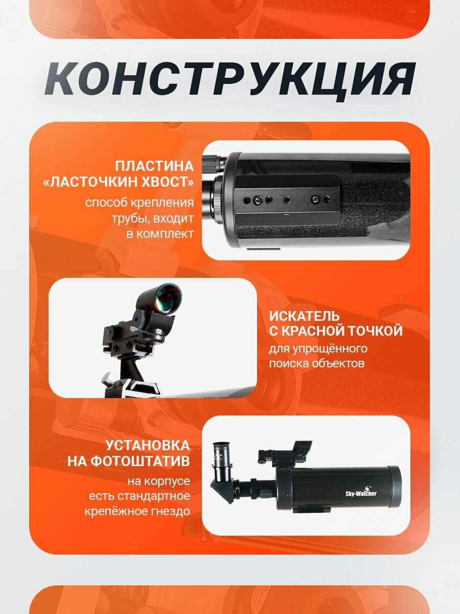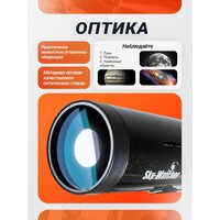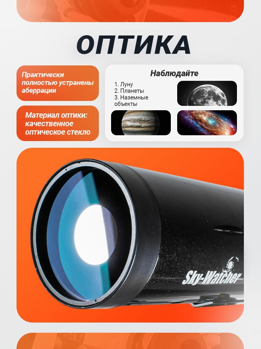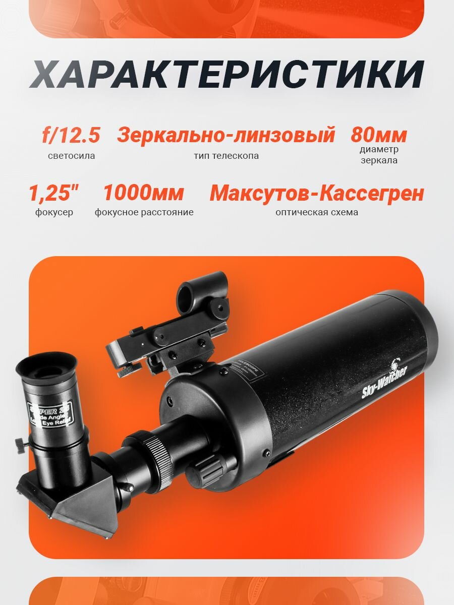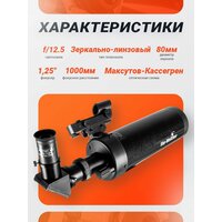 Эта модель собрана по схеме Максутова-Кассегрена, поэтому аберрации практически отсутствуют. В комплект входят окуляры с фокусным расстоянием 25 мм и 10 мм. Первый в большей степени подходит для обзорных наблюдений, а второй лучше использовать для более детального изучения небесных тел. Искатель с красной точкой поможет быстро навестись на любой интересующий вас объект. Труба комплектуется диагональным зеркалом, которое позволяет вести наблюдения из наиболее удобного положения.