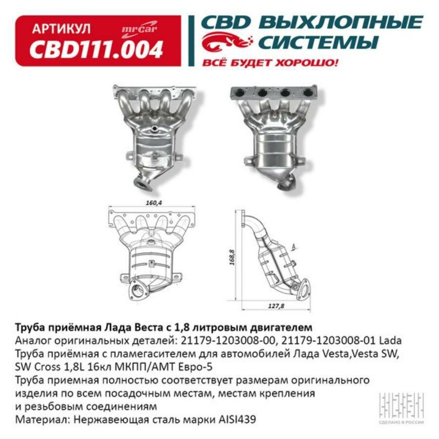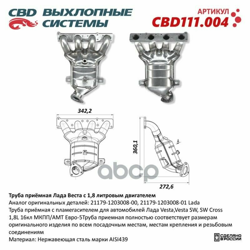 CBD CBD111.004 Труба приемная с пламегасителем для автомобилей Лада Vesta, Vesta SW, SW Cross 1,8L 16кл МКПП/АМТ Евро-5. CBD111.004: сравнение цен, характеристики, фото, актуальное наличие и цены.