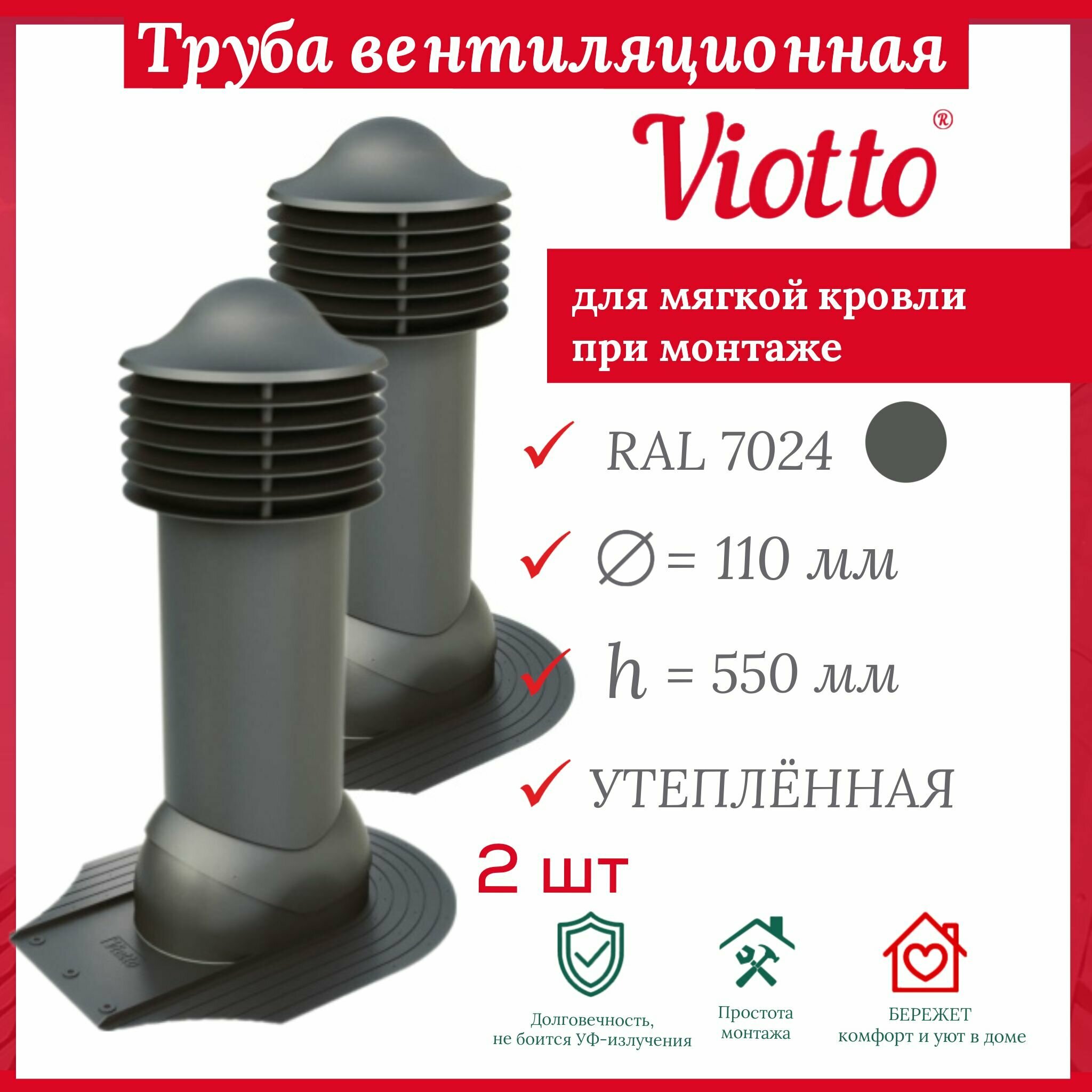 Труба вентиляционная утепленная, Viotto, 110/550мм, комплект вентиляции для мягкой кровли при монтаже, RAL 7024, 2 шт.: сравнение цен, характеристики, фото, актуальное наличие и цены.