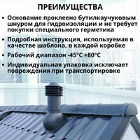 Основные преимущества вентиляционной трубы Viotto: • Устойчивость к температурным перепадам; • Рабочий диапазон температур от – 45 ℃ до +80 ℃; • Индивидуальная упаковка каждого изделия, исключающая повреждение товара при транспортировке; • Выход вентиляции канализации и труба вентиляционная выполнены в едином стиле и гармонично смотрятся на кровле; • Для помощи в установке имеется встроенный пузырьковый уровень на шарнире трубы; • Основание трубы для вентиляции разработано с учетом характеристик кровельного покрытия; • Гарантия 7 лет. Для вашего удобства и экономии затрат предлагаем готовое коробочное решение для обустройства вентиляции в доме. В комплект входят: труба вентиляционная диаметр 125 см, понятная инструкция по монтажу, проходной элемент, гофра и комплект крепежа и бутилкаучковый шнур (только для оснований на металлочерепицу и гибкую черепицу в готовую кровлю). Обратите внимание! Вентиляционную трубу не рекомендуем устанавливать на выходы канализации и использовать совместно с газовым отоплением.