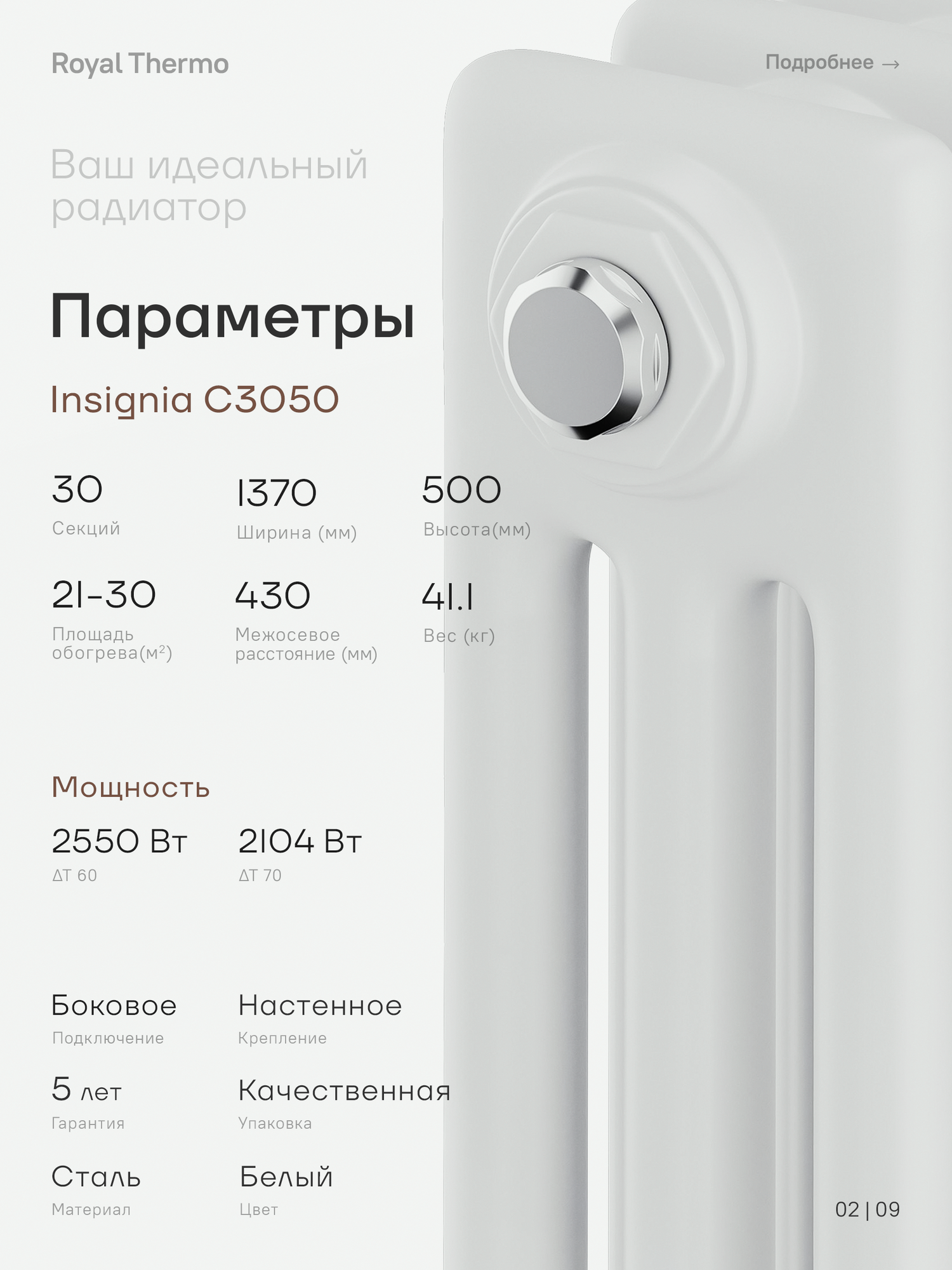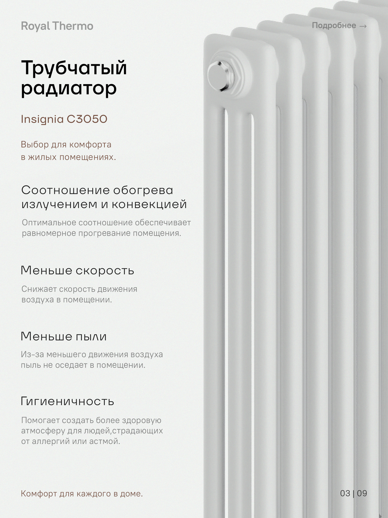 Трубчатый радиатор Royal Thermo Insignia C_3050, 30 секций, белый, боковое подключение 1/2″: сравнение цен, характеристики, фото, актуальное наличие и цены.
