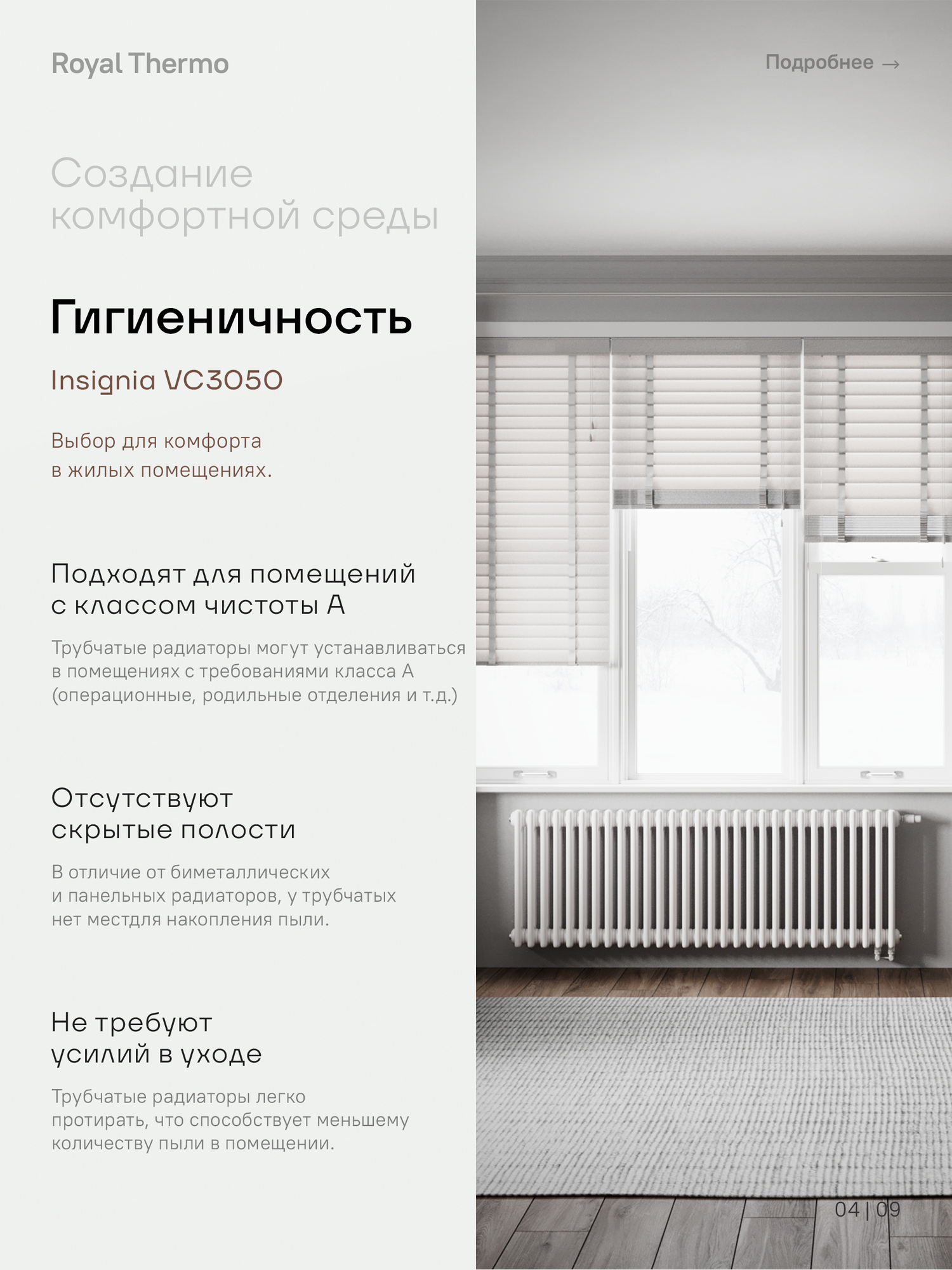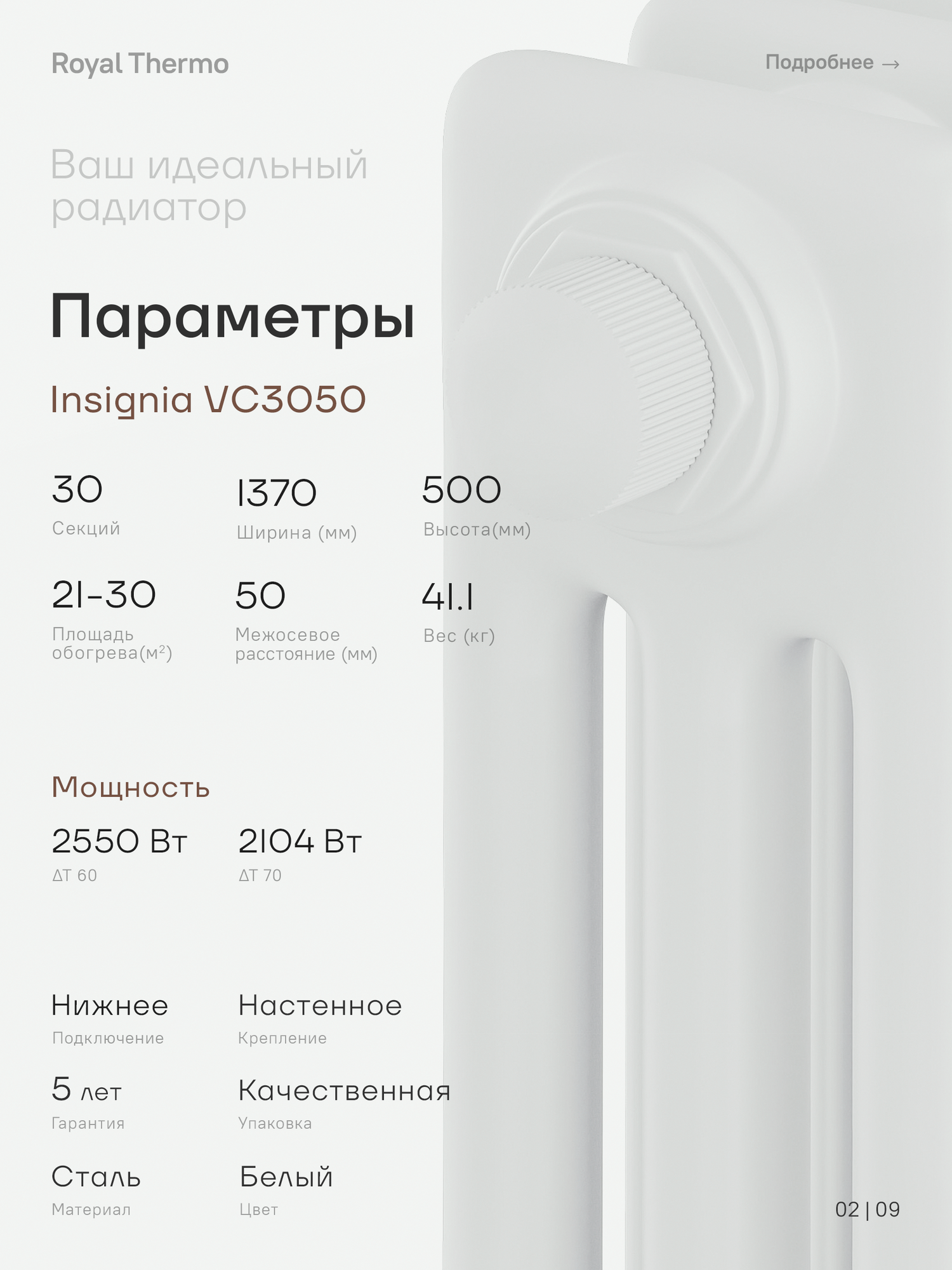 Купить Трубчатый радиатор Royal Thermo Insignia VC_3050, 30 секций, белый, нижнее подключение 1/2″ с доставкой по всей России.