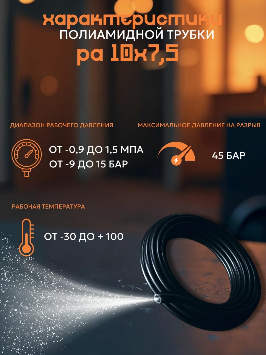 1. Устойчивость к давлению: Трубка выдерживает рабочее давление до 15 бар, что делает её идеальной для систем среднего давления, включая пневматические и топливные магистрали.