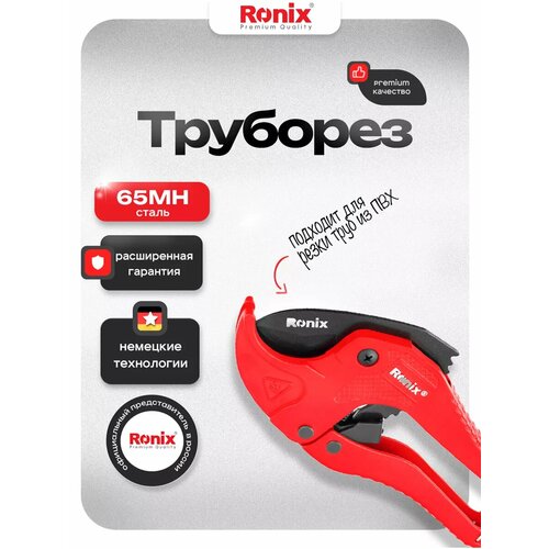 Труборез от немецкого бренда Ronix предназначен для резки ПВХ, ХПВХ, PEX, PPR труб, наружный диаметр которых до 42 мм. Это надежный инструмент в работе с различными материалами. Ножницы обеспечивают чистый и аккуратный разрез без окалины. Благодаря своей функциональности и качеству бренда Ronix станут незаменимым помощником при монтаже и ремонте в системах водоснабжения или отопления. Корпус выполнен из алюминия, благодаря чему инструмент легок и надежен в работе, на рукоятках есть антискользящие насечки, которые делают захват удобнее. Лезвия трубореза съемные и выполнены из нержавеющей стали. Предохранительный замок на хвостовике поможет вам зафиксировать лезвие инструмента в безопасном положении. При отрезании трубы с помощью трубореза получается ровный срез под углом 90° без деформации трубы.