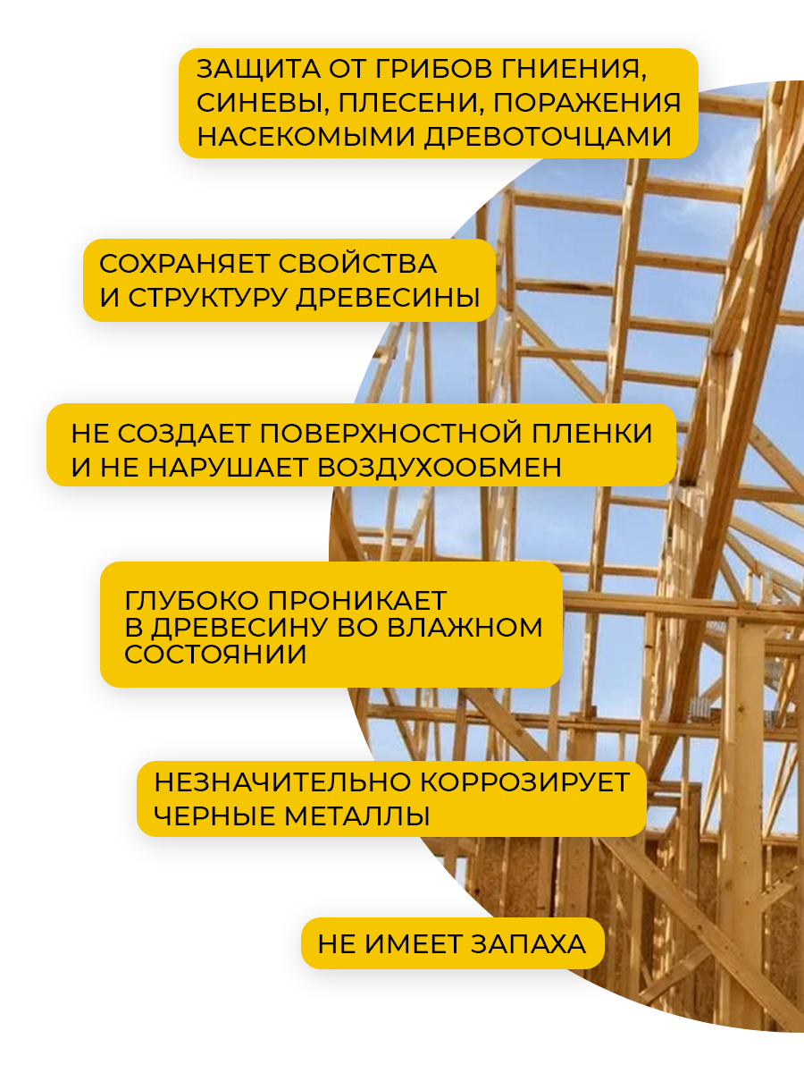 Антисептик хмбб произведён по ГОСТ 28815-18. Антисептик предназначен для защиты деревянных строительных конструкций от биологического разрушения (грибов гниения, синевы, плесени, поражения насекомыми древоточцами) в условиях умеренного вымывания, промерзания, контакта с периодически увлажняемыми материалами. Объекты зашиты: каркасные дома, срубы, лаги, стропила, балки, несущие брусья, перекрытия и т. п.