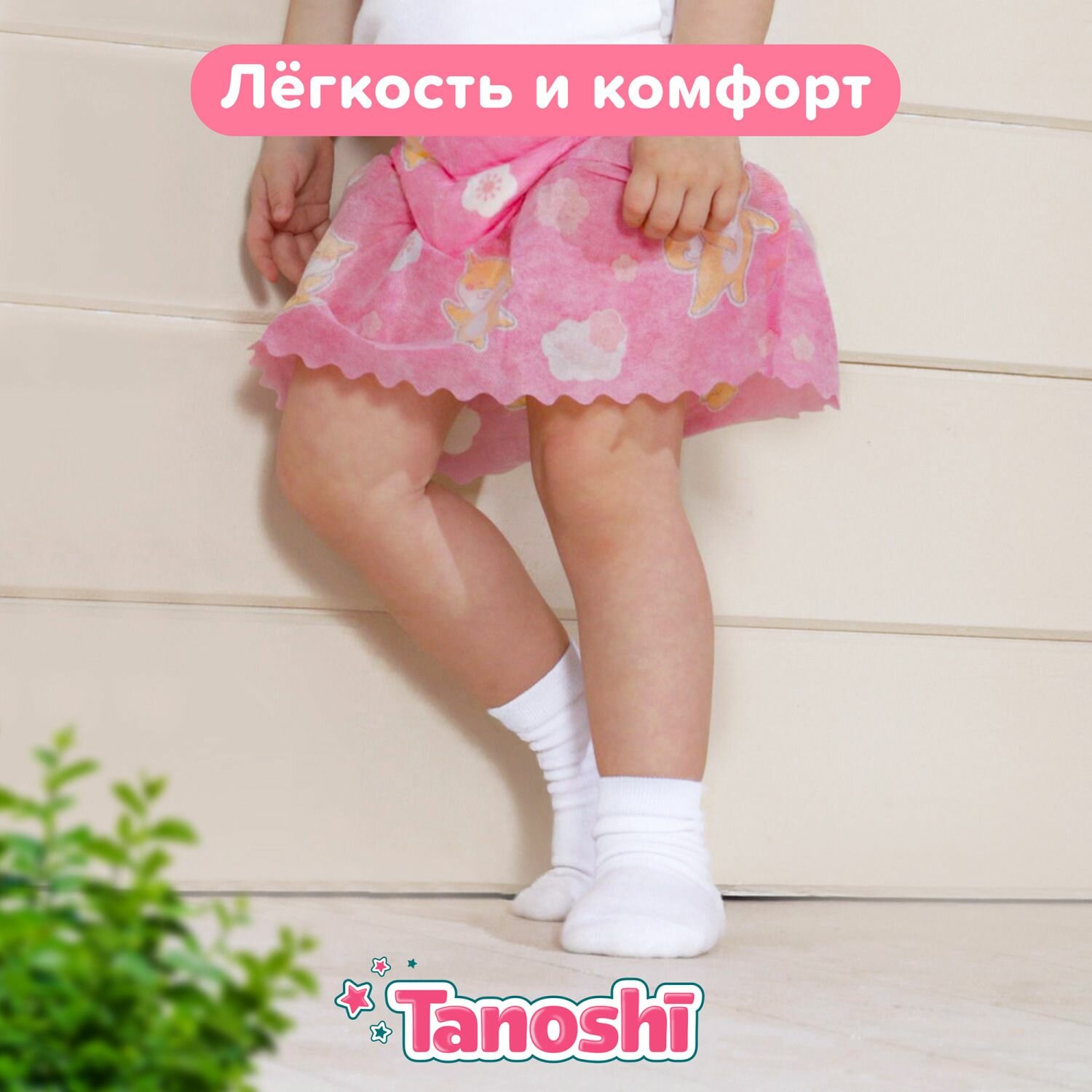 Лимитированная коллекция трусиков Tanoshi (Таноши) для девочек – новинка от полюбившегося бренда детских подгузников в форме удобной летней юбочки для маленьких модниц. Идеальны для прогулок в тёплое время года, поездок, дачи, пляжа, отпуска и дома в жаркую погоду. Стильные, ультратонкие (3,5 мм) подгузники трусики не требуют дополнительного слоя одежды, что обеспечивает малышке свободу движений, ощущение легкости и комфорта, а маме сокращает количество вещей для ежедневной стирки. Тонкий и нежный материал юбочки приятен для ножек малышки, а мягкие боковые швы, заклеены наружу, не контактируют с кожей ребёнка и легко разрываются при смене подгузника. Трусики подгузники удобно надевать и снимать, они не сползают во время ношения, а свободный крой юбочки не ограничивает движений подвижного ребёнка. Из чего состоят Tanoshi? Нетканое волокно из целлюлозы, произведённое по технологии AirLaid («воздушная укладка»), позволяет сделать трусики Tanoshi ультратонкими, но при этом отлично впитывающими и не протекающими. Суперабсорбент от японского производителя Sumitomo гарантирует мгновенную впитываемость и равномерное распределение влаги по всей поверхности трусиков. Нежный внутренний слой мягко прилегает к коже и обеспечивает равномерное распределение жидкости. Дышащий внешний слой пропускает влажный воздух, сохраняя кожу малыша сухой. Двойные мягкие оборочки вокруг ножек малыша и эластичный поясок на спинке хорошо прилегают к телу ребёнка и защищают от протеканий. С трусиками Tanoshi – удобно и родителям, и малышу! Мягкий боковой шов, неощутимый для нежной кожи ребёнка, легко разрывается при замене трусиков. Трусики не провисают, не прилипают и не сбиваются в комок между ножек, даже когда переполнены. Кожа малыша надежно защищена от опрелостей, раздражения и «парникового эффекта» без присыпок и детского крема. Ультратонкие трусики могут стать отличной заменой привычной одежде для летних прогулок, поездок или отпуска, не требуют дополнительного слоя одежды. Красочный дизайн летней юбочки Tanoshi с улыбающейся собакой японской породы Сиба-Ину поможет создать хорошее настроение ребенку и его родителям на весь день. С Tanoshi – безопасно: Гипоаллергенные Tanoshi сохраняют кожу ребёнка сухой между сменой трусиков. Не содержат отдушек и пропитки. Трусики-юбочка Tanoshi для девочек выпускаются в размерах: L (размер 4, 9-14 кг), XL (размер 5, 12-17 кг). Состав: нетканый материал, суперабсорбирующий полимер, распушенная целлюлоза, дышащая полиэтиленовая пленка, спандекс, термоклей Инструкция: Просуньте руки в отверстия трусиков-подгузников и проденьте в них ножки малыша. Натяните трусики-подгузники выше пупочка. Расправьте наружу оборочки вокруг ножек. Меры предосторожности: Меняйте трусики-подгузники так часто, как это необходимо, и после каждого стула. Если на коже появилось раздражение, прекратите использование трусиков-подгузников и обратитесь к врачу. Храните в недоступном для детей месте, чтобы предотвратить попадание трусиков-подгузников или упаковки в рот ребенка. Только для наружного применения. Не предназначены для стирки. Если вы случайно постирали использованные трусики-подгузники с вещами, после отжима стряхните оставшиеся на одежде гелеобразные частицы и аккуратно протрите барабан. Характеристики: Страна-производитель – китай. Габариты упаковки – 13