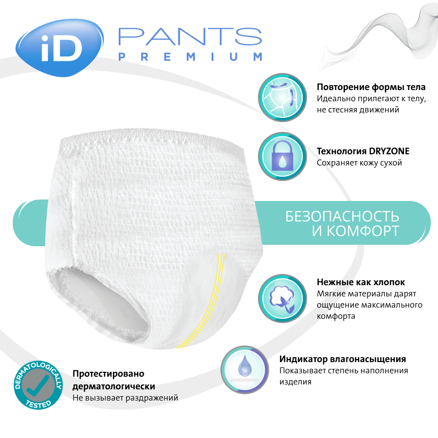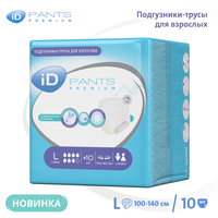 Подгузники трусики для взрослых размер L iD Pants Premium - это комфортное и бюджетное решение для людей, желающих надёжно скрыть проявления недержания малой, средней и тяжёлой степени. Упаковка состоит из 10 штук унисекс трусиков размера L (large) (3). Вся продукция iD протестирована дерматологами и не вызывает раздражений. Впитывающие трусы памперсы размер large супер качества с надёжными резинками фиксаторами для взрослых подойдут для мужчин и для женщин. Послеродовые одноразовые трусы удобно взять с собой в роддом. Удобно использовать как послеродовые одноразовые трусы, и для дневной и ночной защиты от протеканий девушек во время месячных при обильных менструальных выделениях. Так же обеспечат надёжный барьер от протеканий на ночь при более скудных выделениях. Одноразовые трусики подгузники для взрослых и малоподвижных людей подойдут для использования во время длительных медицинских процедур, исключающих возможности передвижения пациента, например, длительные капельницы. Памперсы трусы для взрослого айди пантс размер л достаточно тонкие, чтобы быть незаметными под летней одеждой. Универсальное средство личной гигиены, памперсы трусики для взрослого L подойдут на обхват талии 100-140 см. "Особенности конструкции iD PANTS Premium позволили сделать все ключевые преимущества индивидуальных впитывающих гигиенических средств доступными, по более дешевой цене. Дешевые подгузники бренда ID не уступают по качеству более дорогим брендам. Многоуровневый впитывающий слой обеспечивает высокую скорость абсорбции даже больших объёмов жидкости и превращение её в гель. Особый состав впитывающего слоя препятствует образованию аммиака, а значит – распространению неприятных запахов. Создатели подгузников-трусов айди пантс разработали надёжную многоступенчатую защиту от протеканий в виде влагонепроницаемых бортиков, мощного впитывающего слоя и плотного прилегания изделия к изгибам тела. Более частая смена pampers помогает защитить чувствительную кожу промежности от воздействия перегрева, опрелостей и повышенной влажности каждый день." Подгузники-трусы айди пантс премиум соединили в себе комфорт привычного нижнего белья и высокую впитывающую способность. Они имеют мягкий дышащий внутренний слой, моментально нейтрализуют неприятные запахи и повторяют все изгибы тела, сохраняя плотное прилегание даже при активном движении. Изделие отличается повышенной скоростью впитывания влаги, благодаря улучшенному абсорбирующему слою. А наличие индикатора наполнения подгузника помогает легко понять, когда пора сменить изделие на новое. Чтобы подгузники-трусы еще проще стало надевать, на поясе со стороны спины размещен специальный индикатор. Дышащие эластичные плотные урологические медицинские изделия производства бельгийского бренда в стиле одноразовых трусов - комфортная защита для взрослых людей от недержания мочи маленькой, средней и большой степени. Анатомическая форма трусиков айди пантс премиум плотно прилегает, удерживает влагу, блокирует запахи и впитывает ночные выделения. Все эти защитные свойства подойдут для медицинской реабилитации, для здоровья промежности лежачих больных, инвалидов, пожилых мужчин и женщин. Памперсы для взрослого человека выполнены из мягких нетканых водонепроницаемых материалов и гипоаллергенны. Днем носятся