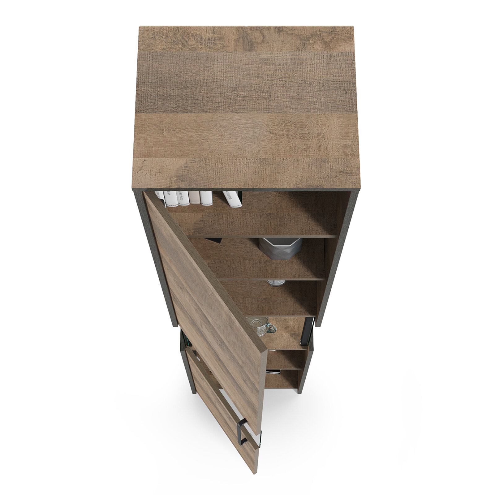 Лицевая фурнитура с тем же покрытием придаёт мебели индустриальную эстетику.