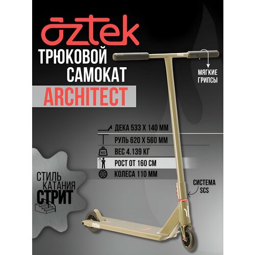 Трюковой самокат от бренда Aztek модель Architect, с компрессионной системой SCS, очень мягкими и комфортными грипсами, идеально подойдет для опытных райдеров с ростом от 160 см, внешний диаметр руля так же как и внутренний диаметр зажима состовляет 31.8 мм, интегрированная рулевая с промышленными подшипниками и фирменным пыльником, дека с нажимным тормозом, под интегрированные рулевые, которая вмещает колеса с диаметром до 110 мм, и шириной колес до 24 мм, интегрированная вилка которая вмещает в себя колеса до 110 мм, и шириной колес до 24 мм, колёса 110 мм. с подшипниками Abec 9.