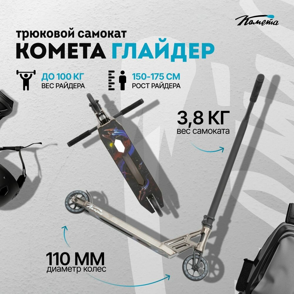 Трюковой самокат двух колесный стрит / парк Комета Глайдер 510, (черный хром): сравнение цен, характеристики, фото, актуальное наличие и цены.