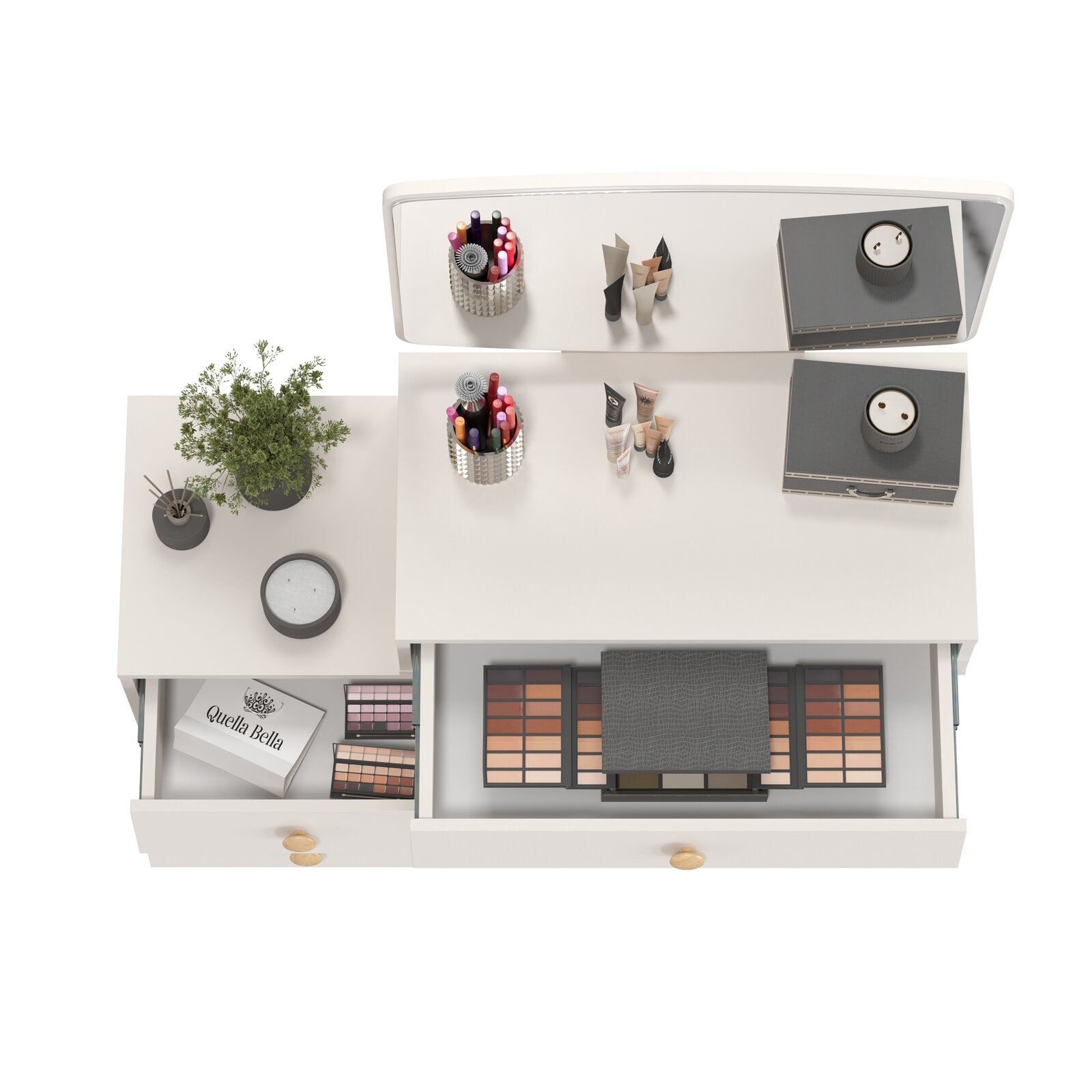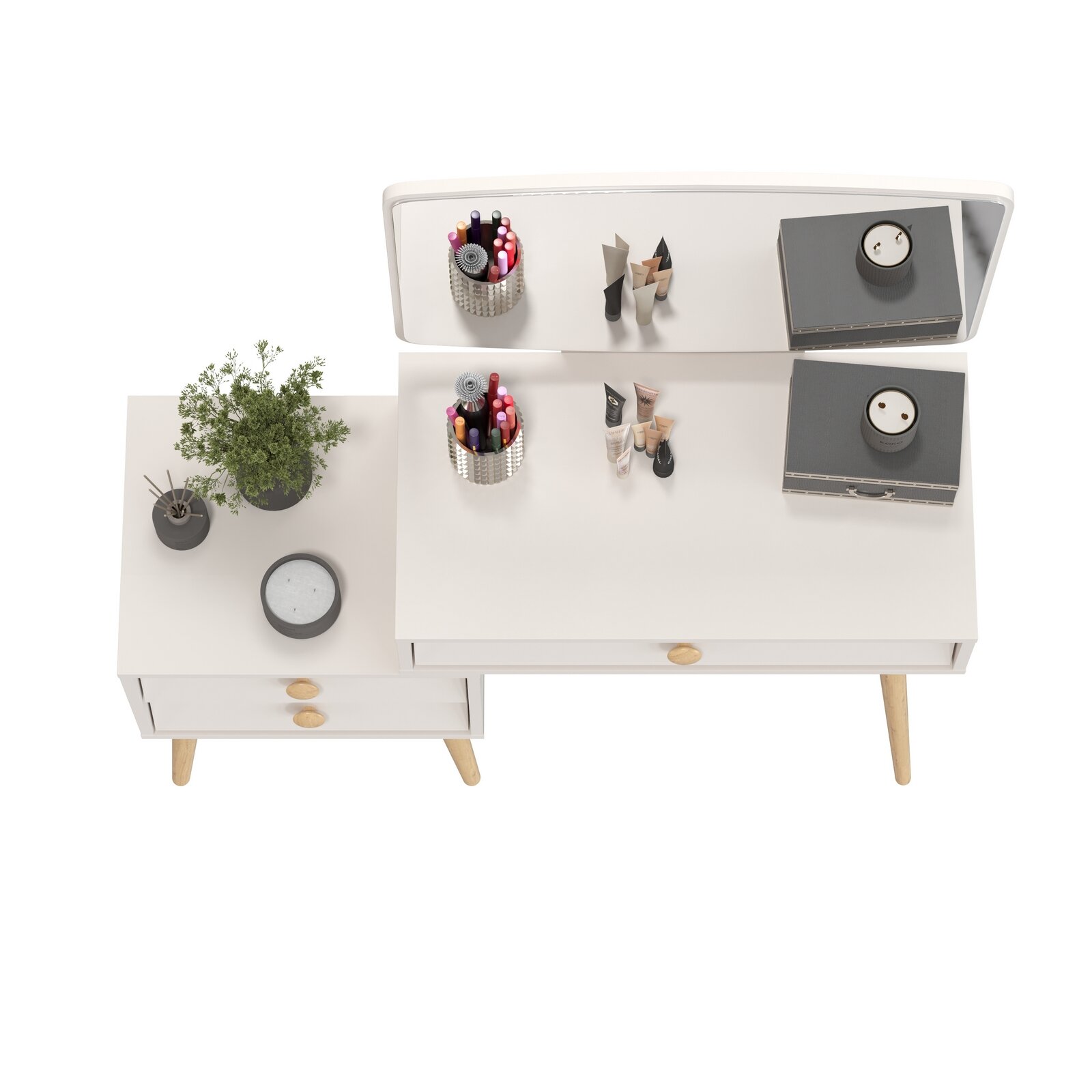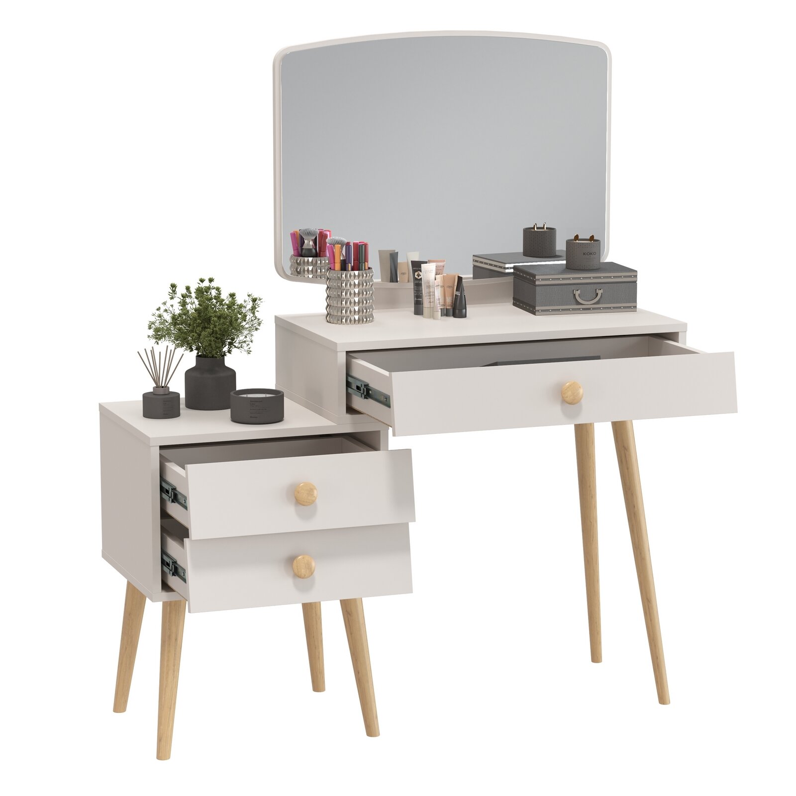 объединяет функции туалетного столика и малой тумбы; оснащено тремя просторными выдвижными ящиками - один под столешницей столика и два в секции тумбы; большое зеркало, расположенное над столешницей туалетного столика; декоративные деревянные ручки круглой формы в цвете бук; установлено на высокие опоры из массива бука - у туалетного столика составляет 60 см, а у тумбы – 30 см; поставляется в разобранном виде, упакованным в 4-х слойный гофрокартон, с подробной инструкцией по сборке и комплектом