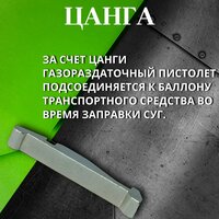 За счет цанги газораздаточный пистолет подсоединяется к баллону транспортного средства во время заправки СУГ.