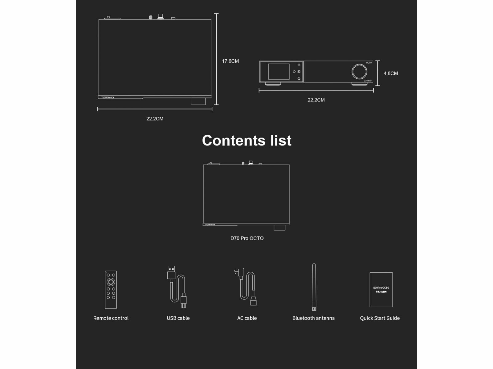 ЦАП Topping D70 Pro обладает многими усовершенствованиями, присущими аудиопродуктам высокого класса. Благодаря высокопроизводительным чипам, часам с ультранизким джиттером, новейшим интерфейсам и большой универсальности, этот конвертер обеспечивает исключительное воспроизведение звука, характеризующееся великолепной прозрачностью и богатством звучания, и при этом обладает практичными и полезными функциями.Мощность D70 Pro обеспечивает очень богатый и детальный уровень воспроизведения звука. D70 Pro имеет широкую системную совместимость: Windows 10, Windows 11, Mac OS, Linux, IOS, Android. Просто подключите его к источнику звука и начните воспроизводить музыку. USB-разъем основан на чипе XMOS XU316 и пользовательском драйвере Thesycon, поэтому он очень стабилен. Благодаря множеству функций и соединений, D70 PRO от Topping впишется в подавляющее большинство аудиосистем, предлагая множество вариантов использования и установки. На стороне входа устройство предлагает AES/EBU, коаксиальный SPDIF, оптический Toslink и USB.На выходе мы находим балансный XLR и небалансный RCA. D70 PRO позволяет выбрать выход, чтобы направить аудиопоток только на один из них или на оба одновременно. Кроме того, выходы XLR 4 В и RCA 2 В могут быть усилены до XLR 5 В и RCA 2,5 В. В D70 Pro встроен новый цветной экран, а также 3 кнопки управления для более удобного использования. Более того, этот экран может отображать некоторую информацию (FTT и VU) в соответствии с вашими потребностями и желаниями. D70 Pro оснащен новым конвертером для достижения совершенства в воспроизведении звука. Эта схема позволяет добиться очень низкого уровня искажений и шума. D70 PRO также выполняет функцию предусилителя, поскольку имеет регулятор громкости. Однако этот регулятор громкости можно отключить, чтобы использовать D70 Pro только как ЦАП с выходными уровнями, постоянно находящимися на максимальном уровне, т.е. 4Vrms для выхода XLR и 2Vrms для выхода RCA. Чип ЦАП ES 9039SPro от ESS является текущим флагманом бренда, обеспечивающим эффективное и точное декодирование. Этот чип позволяет достичь THD+N ниже 0,00008% @ 1Khz и динамического диапазона 128 дБ на выходе RCA, а также THD+N 0,00006% @ 1Khz и динамического диапазона 133 дБ для выхода XLR. Более того, эти чипы поддерживают высокие частоты дискретизации, позволяя вам наслаждаться файлами PCM до 32 бит 768 кГц и DSD до DSD512 Native. Этот ЦАП поддерживает лучшие форматы Bluetooth, такие как LDAC, aptx-Adaptive и apt XHD. Файлы высокого разрешения могут быть переданы на него для превосходного прослушивания, и все это с удобством беспроводной связи. Характеристики Topping D70 Pro:Тип продукта: цапмикросхема ЦАП: ES9039SPROИнтерфейс USB: XMOS XU316Вход: 1x оптический Toslink/ 1x USB-B/ 1x коаксиальный SPDIF/ 1x AES/EBU/ / BluetoothПоддерживаемые частоты дискретизации: USB: PCM до 32 бит 768 кГц / DSD Native до DSD512 / DSD DoP до DSD256/ Коаксиальный, оптический, AES: PCM до 24 бит 192 кГцПоддерживаемые кодеки Bluetooth: Bluetooth: SBC, ACC, LDAC, aptX, aptX HD, aptX AdaptativeВыход: 1x XLR балансный/ 1x RCA небалансныйTHD+N: RCA : XLR : <0.00006% @ 1kHz A-WeightedTHD @ 90Bw (не взвешенный): RCA : / XLR :SNR: RCA : 128dB @ 1kHz A-Weighted/ XLR : 133dB @ 1kHz A-WeightedДинамический диапазон: RCA : 128 дБ @ 1 кГц A-взвешенный / XLR : 133 дБ @ 1 кГц A-взвешенныйЧастотная характеристика: RCA : 20Hz - 20kHz (+/-0.5dB) / 20Hz - 40kHz (+/-0.2dB) / XLR : 20Hz - 20kHz (+/-0.2dB) / 20Hz - 40kHz (+/-0.2dB)Выходное напряжение: RCA : 2.1Vrms @ 0dBFS (режим 4V) / 2.5Vrms @ 0dBFS (режим 5V) / XLR : 4.2Vrms @ 0dBFS (режим 4V) / 5Vrms @ 0dBFS (режим 5V)Шум: RCA: µ Vrms / XLR: µ VrmsКанальные наводки: RCA : -128 дБ @ 1Khz / XLR : -140 дБ @ 1KhzБаланс каналов: RCA : 0,3 дБ / XLR : 0,3 дБВыходной импеда