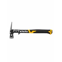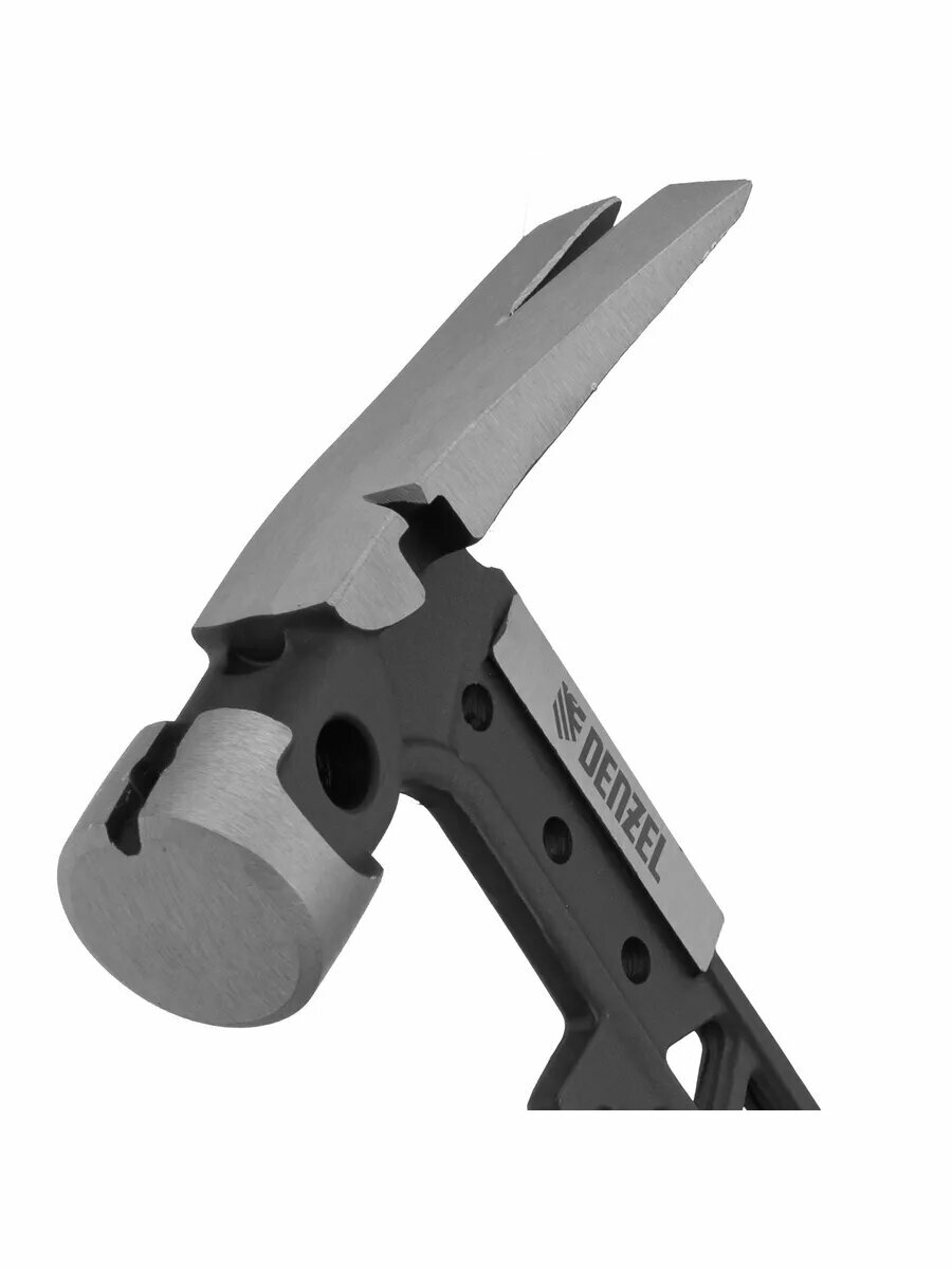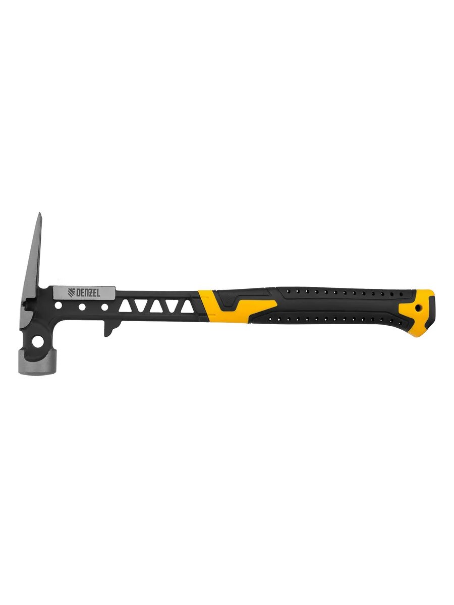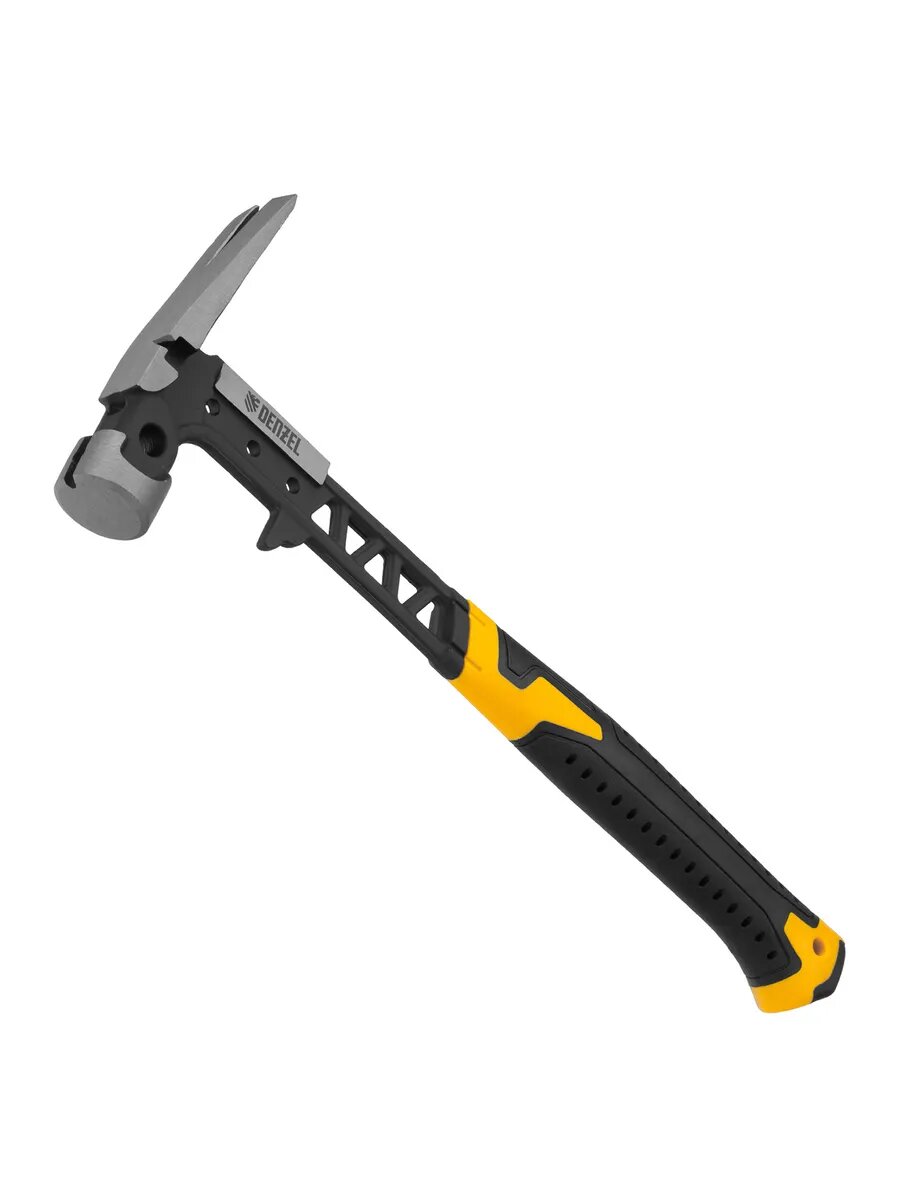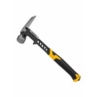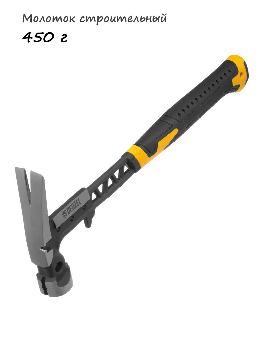 Цельнокованый строительный молоток-гвоздодер с бойком весом 450 г, с магнитом и двухкомпонентной обрезиненной рукояткой, используется при проведении строительных и монтажных работ.