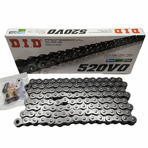 DID 520 VO - недорогая универсальная цепь с O-Ring сальниками DID 520VO подходит для уличных мотоциклов, внедорожных мотоциклов и квадроциклов с объемом двигателя до 750 куб. см. Низкая цена с сохранением высокого японского качества. Цепи 520VO с сальниками O-Ring имеют заклепки с четыремя гранями и кованую втулку, которые обеспечивают высокую прочность и долгий период эксплуатации.