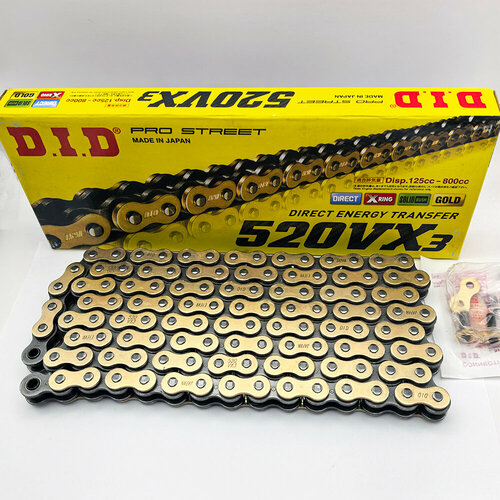 Купить Цепь DID 520VX3 GB X-Ring золотая (замок-защелка) 106 звеньев с доставкой по всей России.