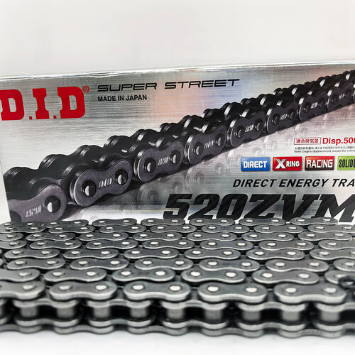 Цепь DID 520ZVM-X: Максимальная эффективность для мощных мотоциклов Топовая цепь для спортивных, туристических и внедорожных мотоциклов объемом до 1200 см³. Разработана на основе технологий MotoGP, обеспечивая рекордную прочность и износостойкость даже при экстремальных нагрузках.
