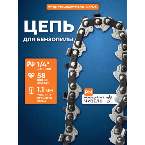 Цепи изготавливаются из высококачественной стали, способной выдерживать высокие нагрузки и обладающей стойкостью к разрывам. Режущие зубья подвергаются индукционной закалке, благодаря чему режущие кромки долго остаются острыми.