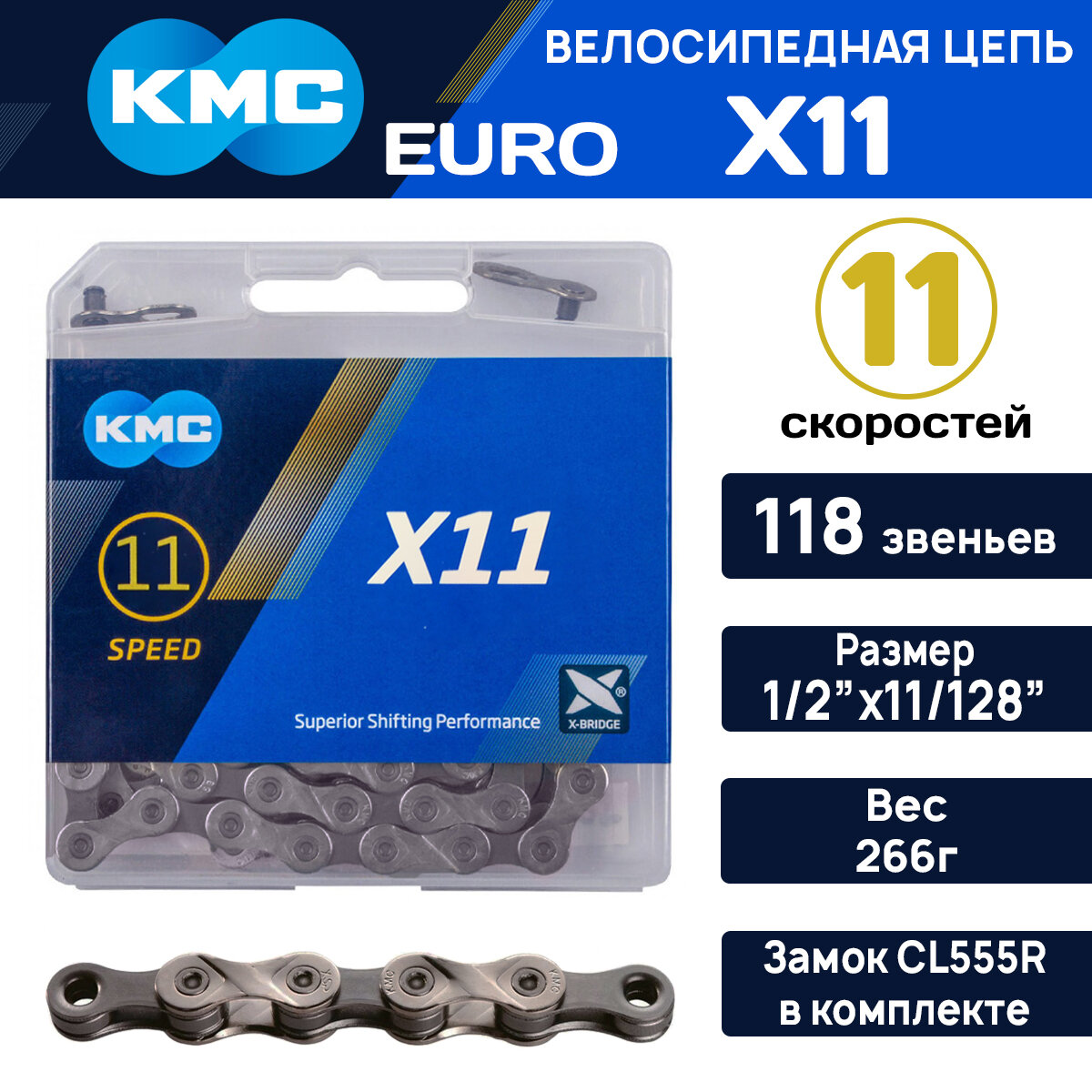 Цепь для велосипеда KMC X-11 на 11 скоростей, 118 зв. + замок СL555R в комплекте, серая совместима SHIMANO, SRAM, SUNRACE: сравнение цен, характеристики, фото, актуальное наличие и цены.