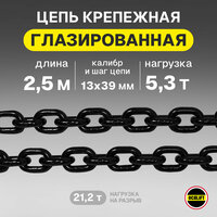 Цепь стальная высокопрочная глазированная с максимальной защитой от коррозии. Используют для подъема грузов на стройке, на производстве, в быту, в гараже. Такая цепь не пачкает руки и к ней не прилипает грязь. Глазировка металла – специальное лаковое покрытие, наносимое методом электрофореза, имеет максимальный коэффициент адгезии, выравнивает все микронеровности, делает цепь гладкой и чистой. Калибр цепи – 13х39 мм ГОСТ - 30188-97 Стандарт - EN 818-2 Класс цепи - цепь грузовая 8 класс прочности, Т8, G80, ISO/80, EN 818-2 Тип цепи - короткозвенная грузоподъёмная круглозвенная калиброванная Длина отрезка – 2.5 метра Диаметр цепи –13 мм Шаг цепи – 39 мм Рабочая нагрузка – 5,3 т Нагрузка на разрыв – 21,2 т Материал - сталь термообработанная, класс прочности 8 Защитное покрытие цепи- черный лак для защиты от царапин и коррозии Применяют в ручных талях - нет Применяют в цепных стропах - да Применяют в электроталях - нет Назначение - для подъема грузов Вес – 9.5 кг