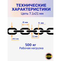 Длина отрезка составляет 3 метра, что позволяет использовать цепь для различных целей. Диаметр цепи - 7 мм, шаг цепи - 21 мм. Грузоподъемность составляет 1600 кг, рабочая нагрузка - 1,6 тонн, нагрузка на разрыв - 6,1 тонн. Разрывное усилие - 61,6 kH.