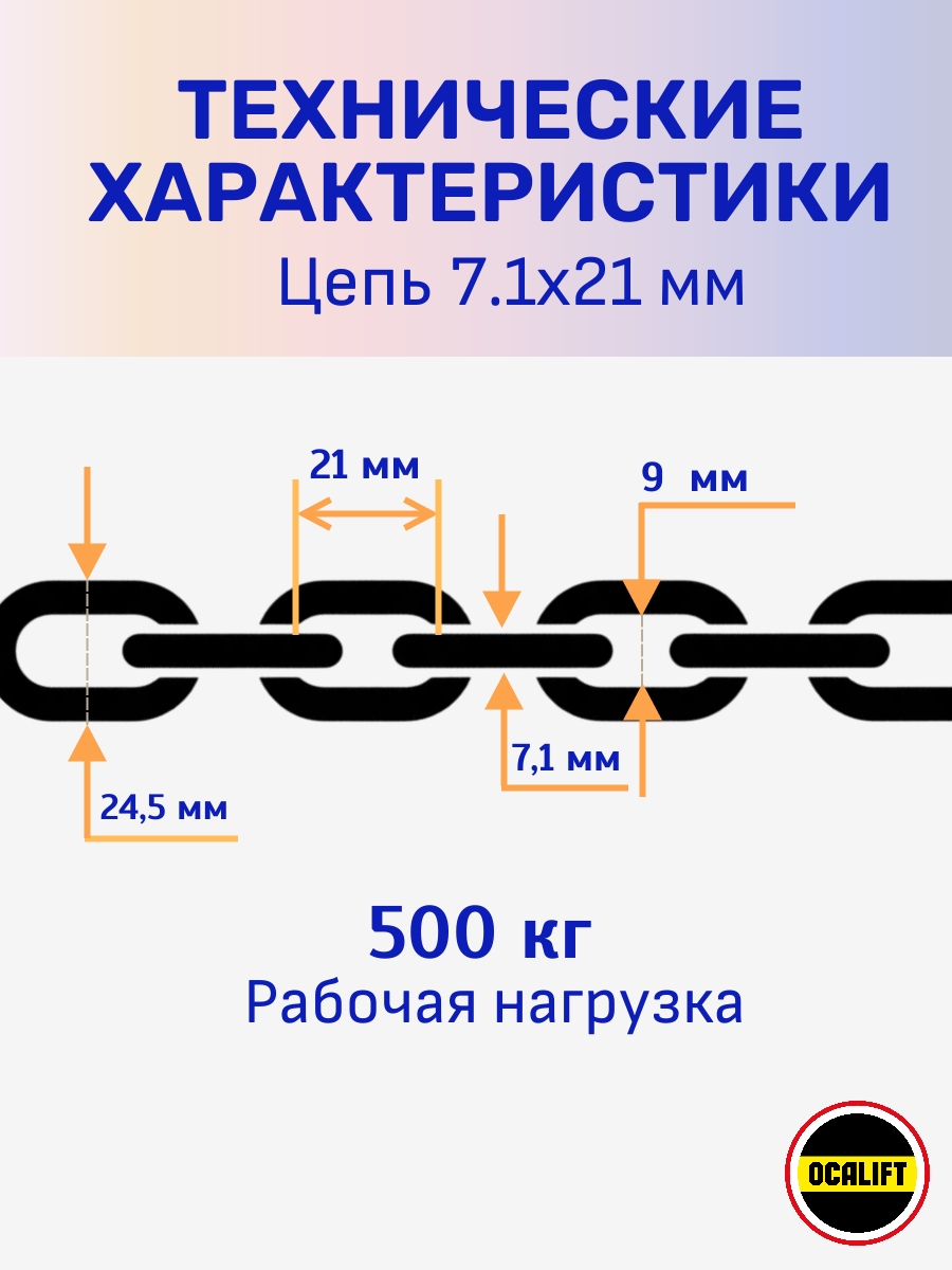 Цепь грузовая 7х21 мм G80 высокопрочная отрезок 2м - это высококачественный такелаж, предназначенный для подъема грузов. Изготовлена из термообработанной стали класса прочности 8, что обеспечивает высокую прочность и долговечность.
