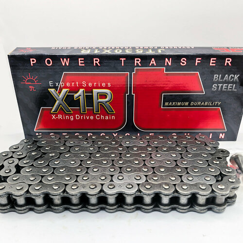 JT 530 X1R - это серия усиленных универсальных цепей с сальниками X-ring, которые подходят для большинства мотоциклов. Они изготовлены из прочного металла и имеют толстые пластины толщиной 2.4 мм и кованые втулки, что обеспечивает высокую долговечность и способность выдерживать большие нагрузки. Рекомендуется использовать эти цепи для двигателей объемом до 900 см3.
