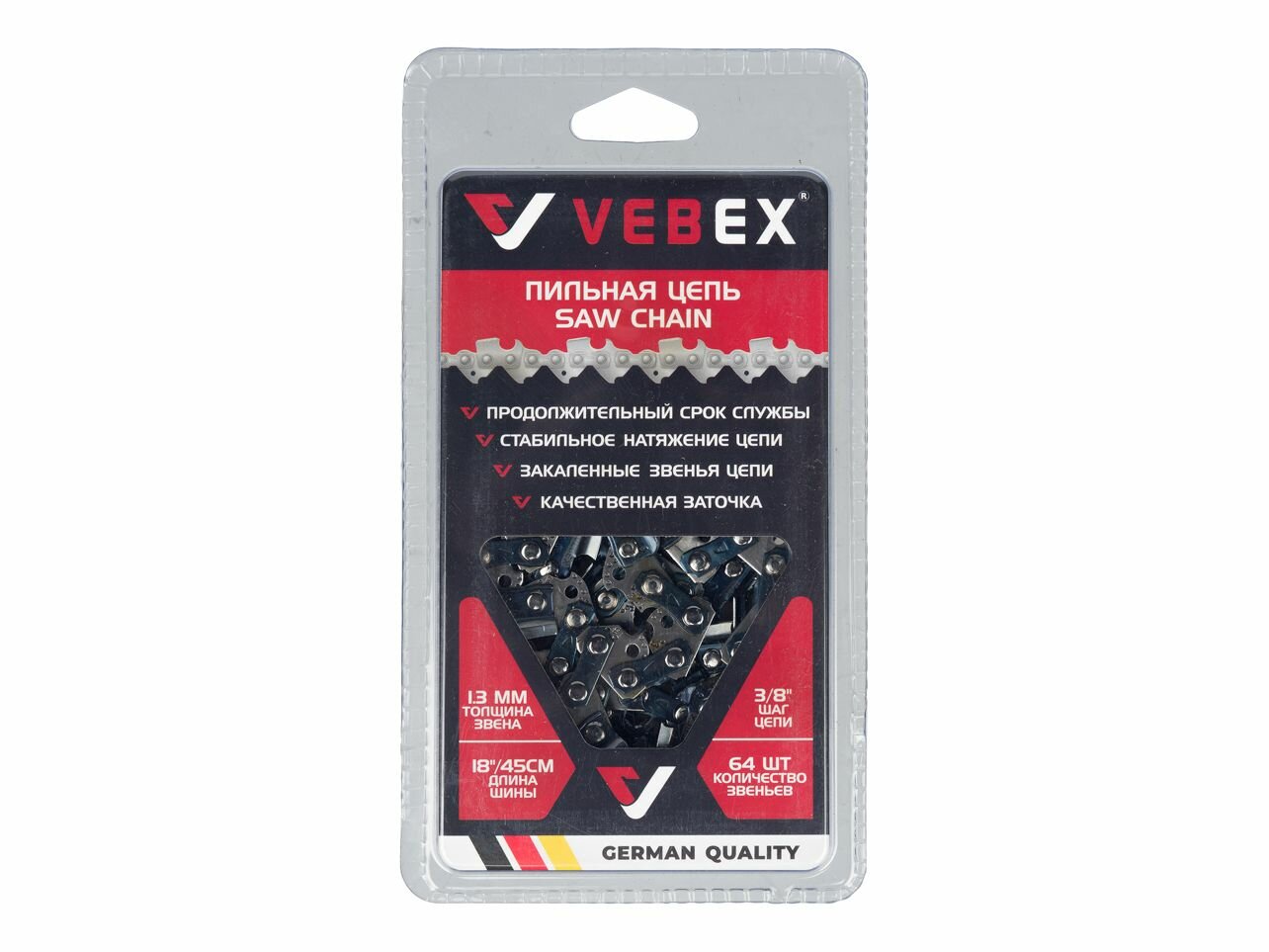 Цепь пильная / цепь для бензопилы 64 звена, паз 1.3 мм, шаг 3/8, шина 18" (45 см) VEBEX