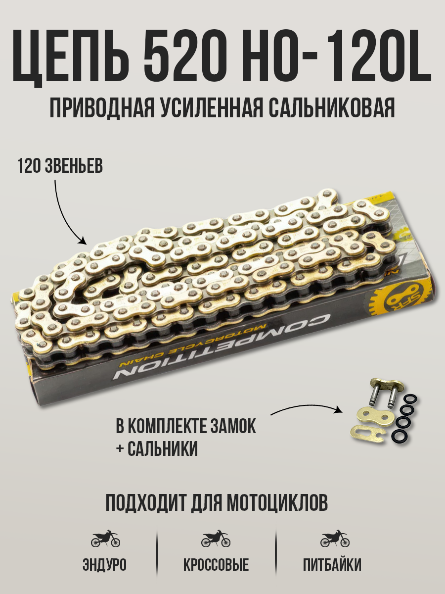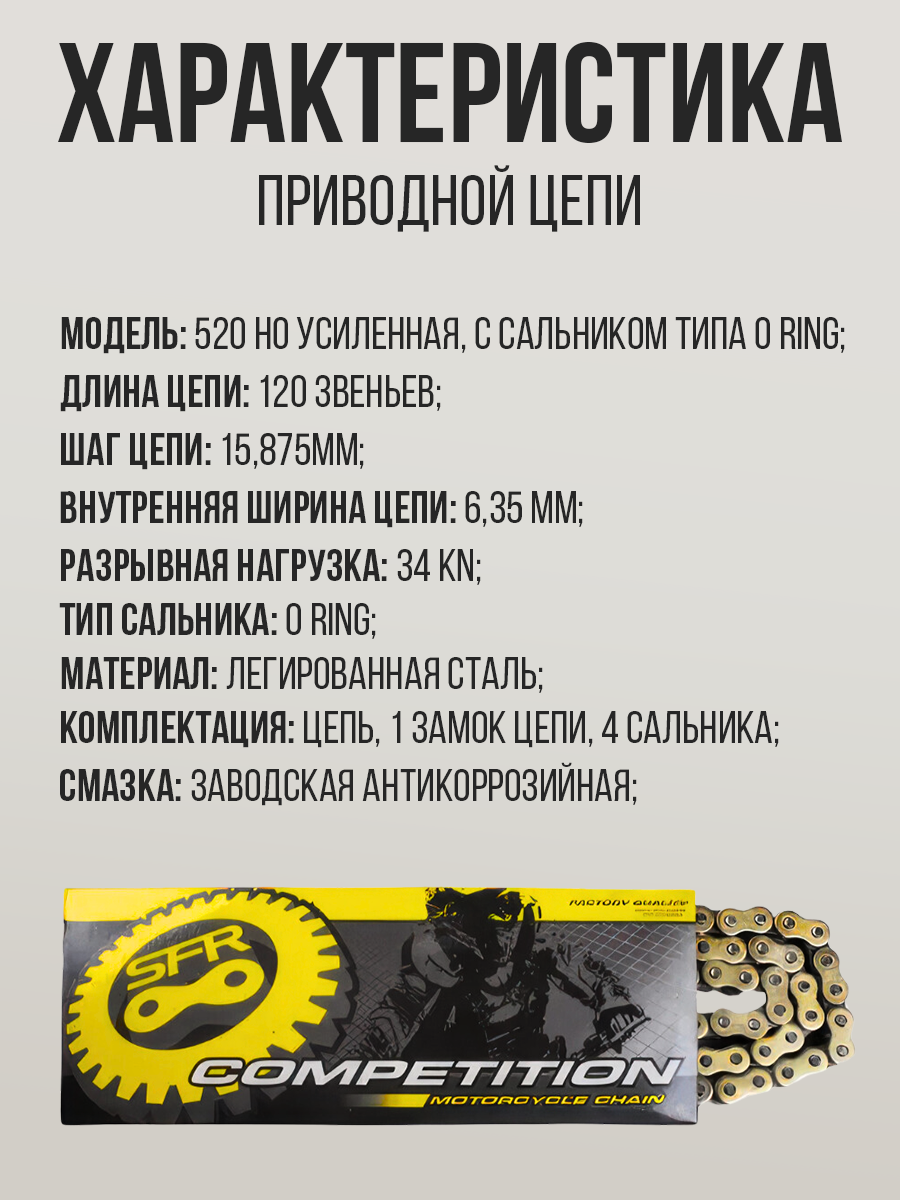 Цепь приводная СФР 520НО 120, усиленная, сальниковая, золотая – это надежный выбор для мотоциклистов, которые ищут оптимальное сочетание качества, долговечности и эффективности. Поддерживайте её в отличном состоянии при помощи регулярной смазки и обслуживания, и она обеспечит уверенность в безопасности на каждом километре пути.