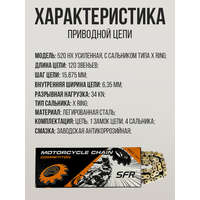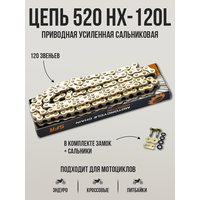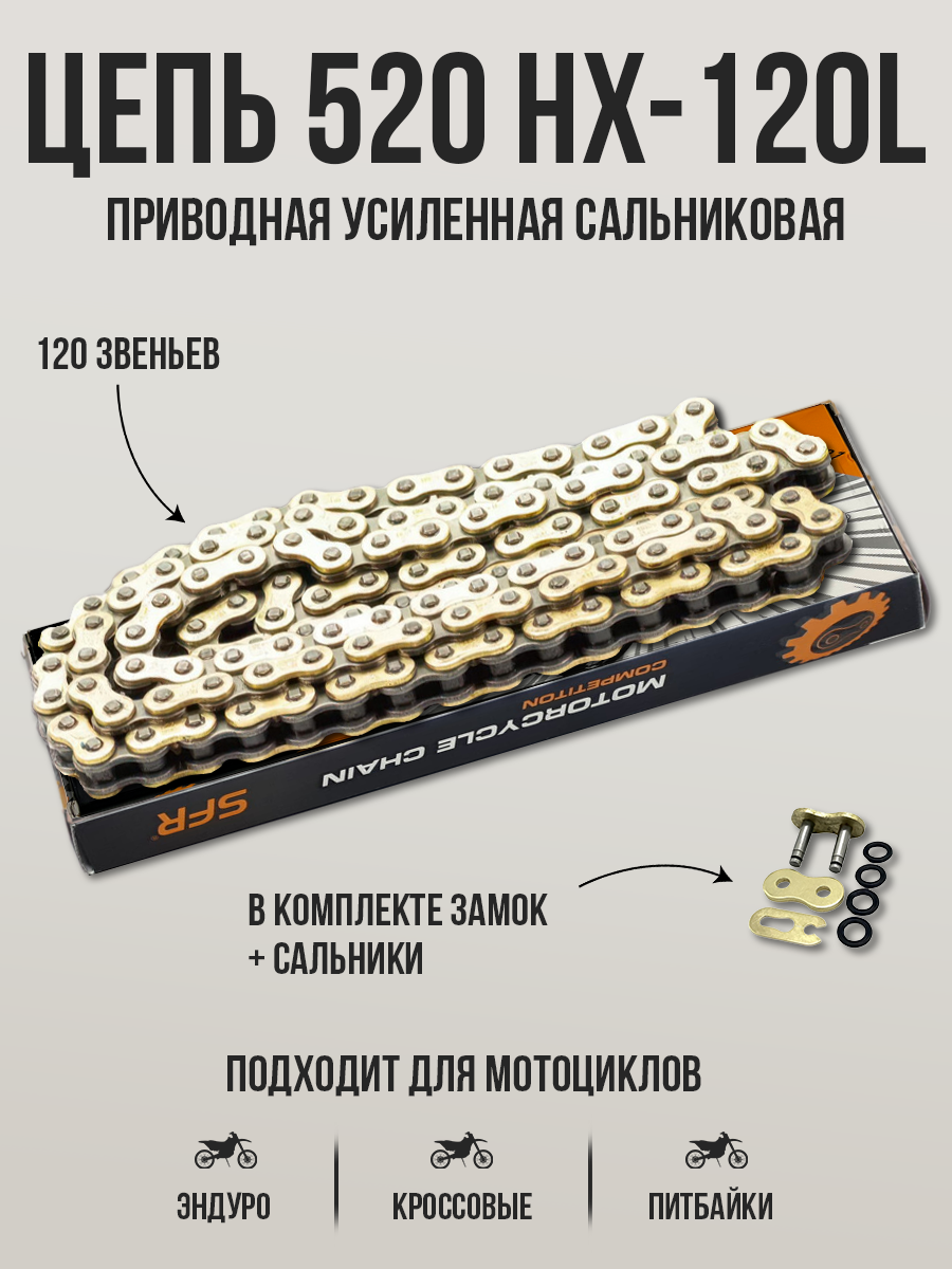 Цепь приводная СФР 520НX 120, усиленная, сальниковая, золотая – это надежный выбор для мотоциклистов, которые ищут оптимальное сочетание качества, долговечности и эффективности. Поддерживайте её в отличном состоянии при помощи регулярной смазки и обслуживания, и она обеспечит уверенность в безопасности на каждом километре пути.