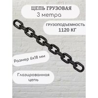 Цепь стальная высокопрочная, покрытие чернение. Используют для подъема грузов на стройке, на производстве, в быту, в гараже. Также цепь можно использовать для собак, от угона велосипеда, можно использовать как цепь для колёс. Калибр цепи - 6х18 мм Цепь изготовлена по ГОСТу - 30188-97 Стандарт - EN 818-2 Класс цепи - цепь грузовая 8 класс прочности, Т8, G80, ISO/80, EN 818-2 Тип цепи - короткозвенная грузоподъёмная круглозвенная калиброванная Длина отрезка - 2,5 метра Диаметр звена цепи - 6 мм, а ширина звена (шаг цепи)- 18 мм Грузоподъемность - 1120 кг Рабочая нагрузка - 1,12 тонн Нагрузка на разрыв - 4,48 тонн Разрывное усилие - 45,2 kH Материал - сталь термообработанная, класс прочности 8 Защитное покрытие цепи - чернение (цепь пачкает руки; цепь, которая не пачкает руки - глазированная) Применяют в электроталях - нет Вес цепи составляет 3 кг