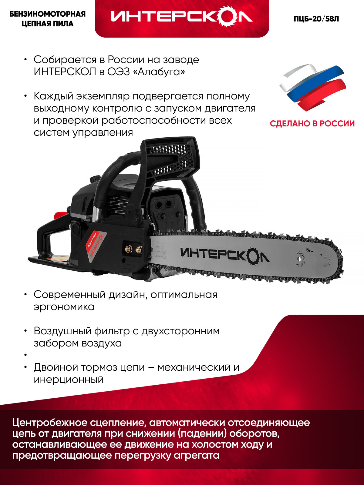 Цепная бензопила ИНТЕРСКОЛ ПЦБ 20/58Л, 2.6 кВт, 50 см 848.0.0.40: сравнение цен, характеристики, фото, актуальное наличие и цены.