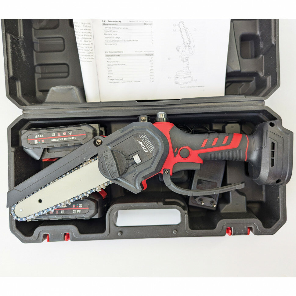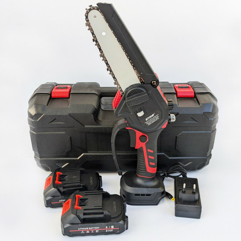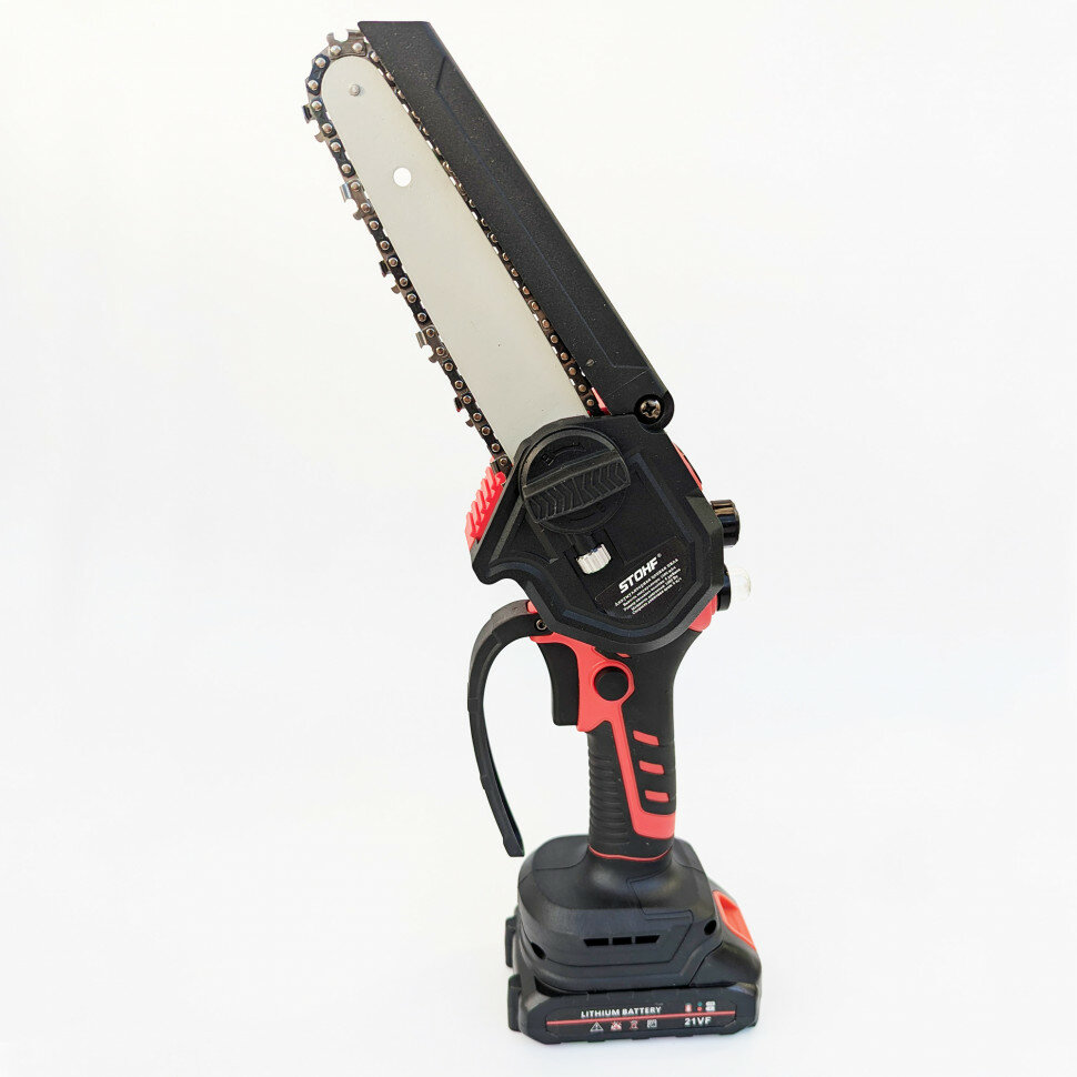 Цепная аккумуляторная пила, незаменима при работе в мастерской или в саду для распила различных материалов, веток и небольших деревьев.