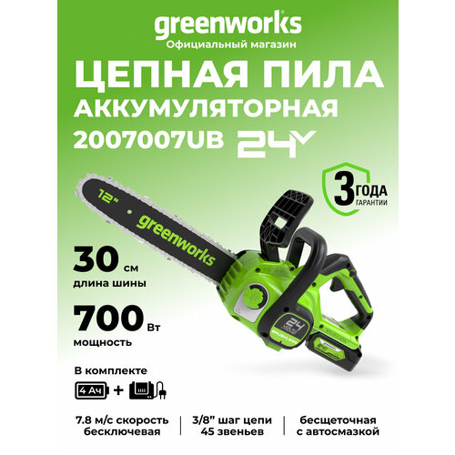 Купить Цепная пила аккумуляторная Greenworks 2007007UB, 24V, 30см, бесщеточная, c 1хАКБ 4 Ач и ЗУ с доставкой по всей России. Цепная пила аккумуляторная Greenworks 2007007UB, 24V, 30см, бесщеточная, c 1хАКБ 4 Ач и ЗУ: сравнение цен, характеристики, фото, актуальное наличие и цены.