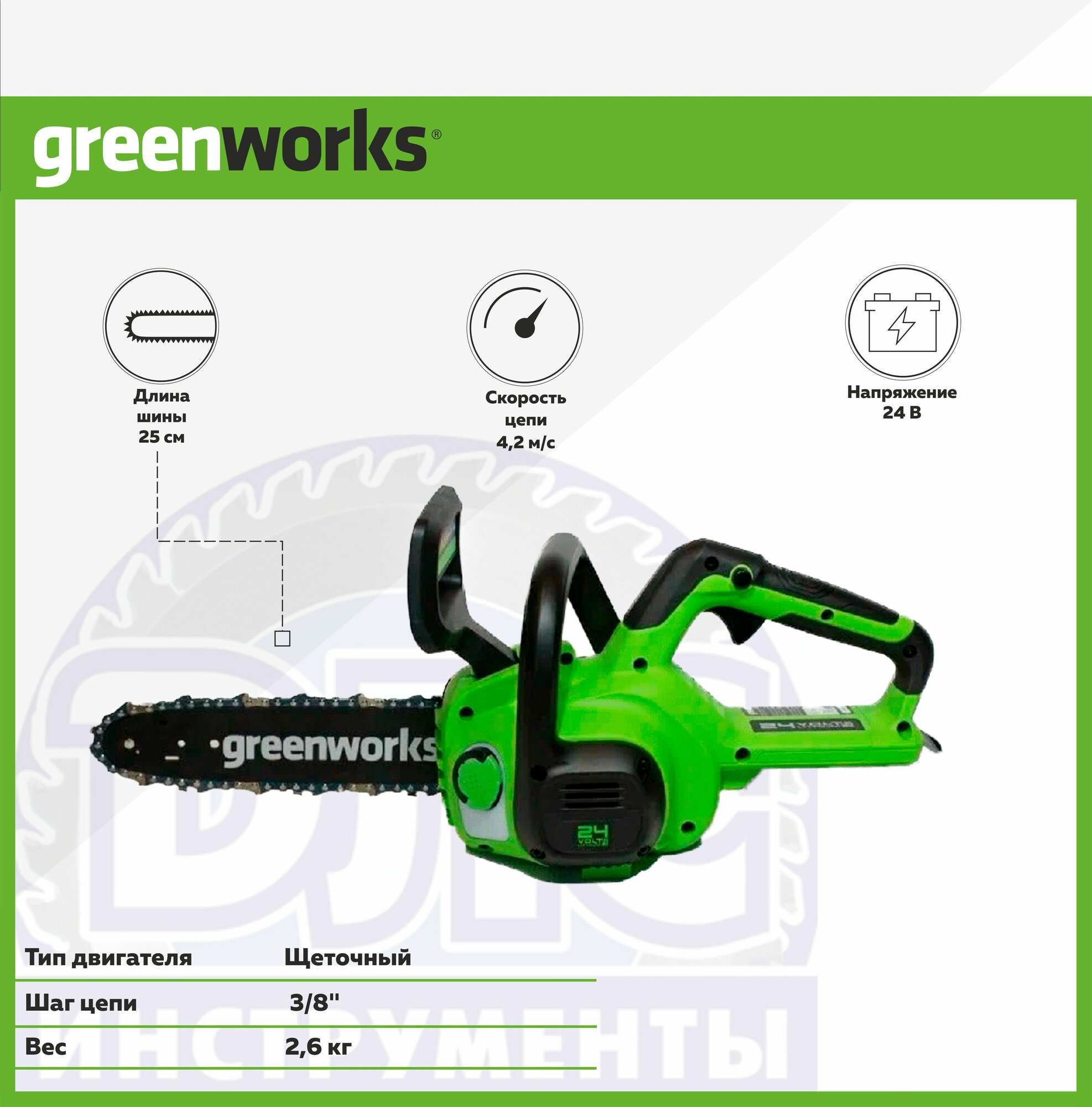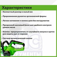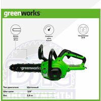Купить Цепная пила аккумуляторная Greenworks Арт. 2007707, 24V, 25см, без АКБ и ЗУ с доставкой по всей России. Цепная пила аккумуляторная Greenworks Арт. 2007707, 24V, 25см, без АКБ и ЗУ: сравнение цен, характеристики, фото, актуальное наличие и цены.