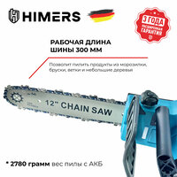 Купить Цепная пила аккумуляторная HIMERS DCP1100B, 24V, 2 АКБ по 6 А. ч, шина 30см, 9 м/сек, 1100Вт, 0-5500 об/мин, Кейс, автоматическая подача масла с доставкой по всей России.
