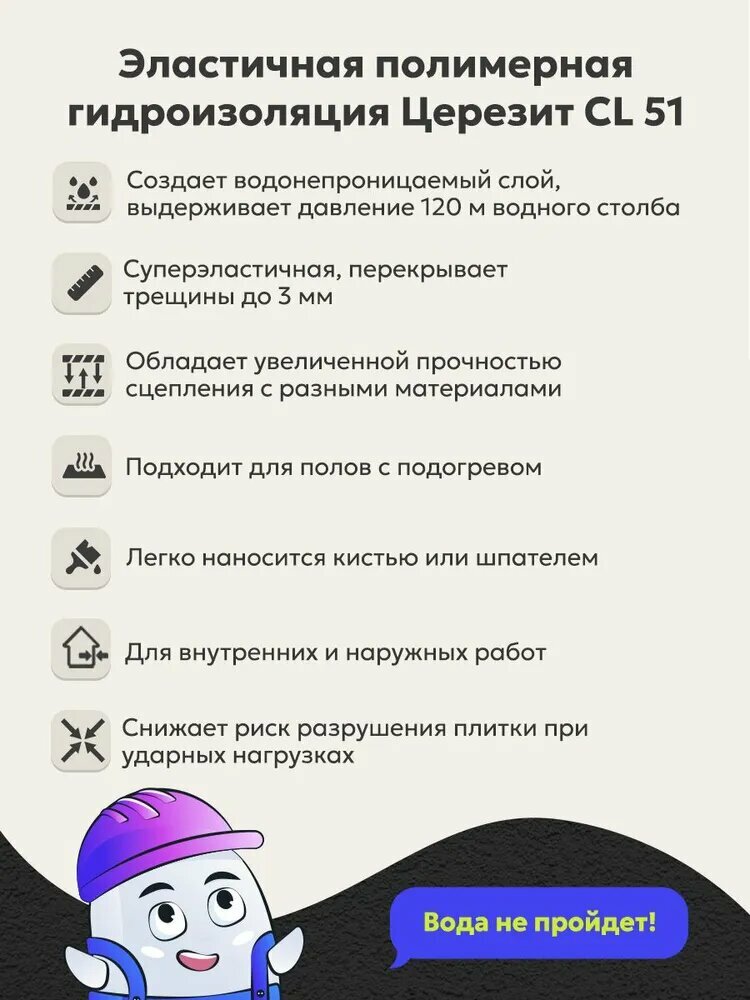 - Подводя итог, можно сказать, что гидроизоляционная смесь Церезит эластичная CL 51 является идеальным выбором для тех, кто ищет качественную готовую смесь для защиты своих построек от влаги. Надежность, долговечность, простота в применении и экологичность – вот основные преимущества этого продукта от известного производителя строительных материалов. Выбирая гидроизоляцию Церезит CL 51, вы можете быть уверены, что ваш дом или офис будут надежно защищены от негативного воздействия влаги на долгие годы.