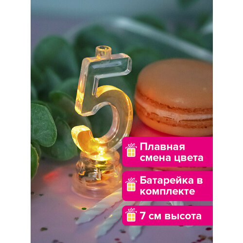 Создайте незабываемую атмосферу на вашем празднике с цифровым подсвечником "5" из серии золотая сказка. Это удивительное украшение для торта станет ярким акцентом на вашем столе, идеально подходя для дня рождения или юбилея. Цифра-подсвечник высотой 7 см выполнена из прозрачного материала и оснащена светодиодом, который создает эффектное свечение. В наборе также представлены 4 парафиновые свечи для торта высотой 6 см, которые легко устанавливаются в держатель. Особенность этого декора – автоматическая плавная смена цвета, что добавляет волшебства в ваш праздник. Включить подсвечник можно с помощью удобного силиконового переключателя на дне. Подсвечник и свечи идеально дополнят любое украшение для комнаты, создавая атмосферу тепла и уюта. Превратите ваш особенный день в сказку с этим замечательным декором!