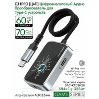 Купить Цифроаналоговый аудио-конвертер ЦАП для Type-C устройств 2-в-1. Для наушников с разъемом Jack 3.5 мм и USB-C с поддержкой PD 60 Вт. Поддерживает разрешение 32 бит/384 кГц. Игровая звуковая карта с чипом KTO2H20. Адаптер с длинным кабелем 70 см, C31-Pro. с доставкой по всей России.