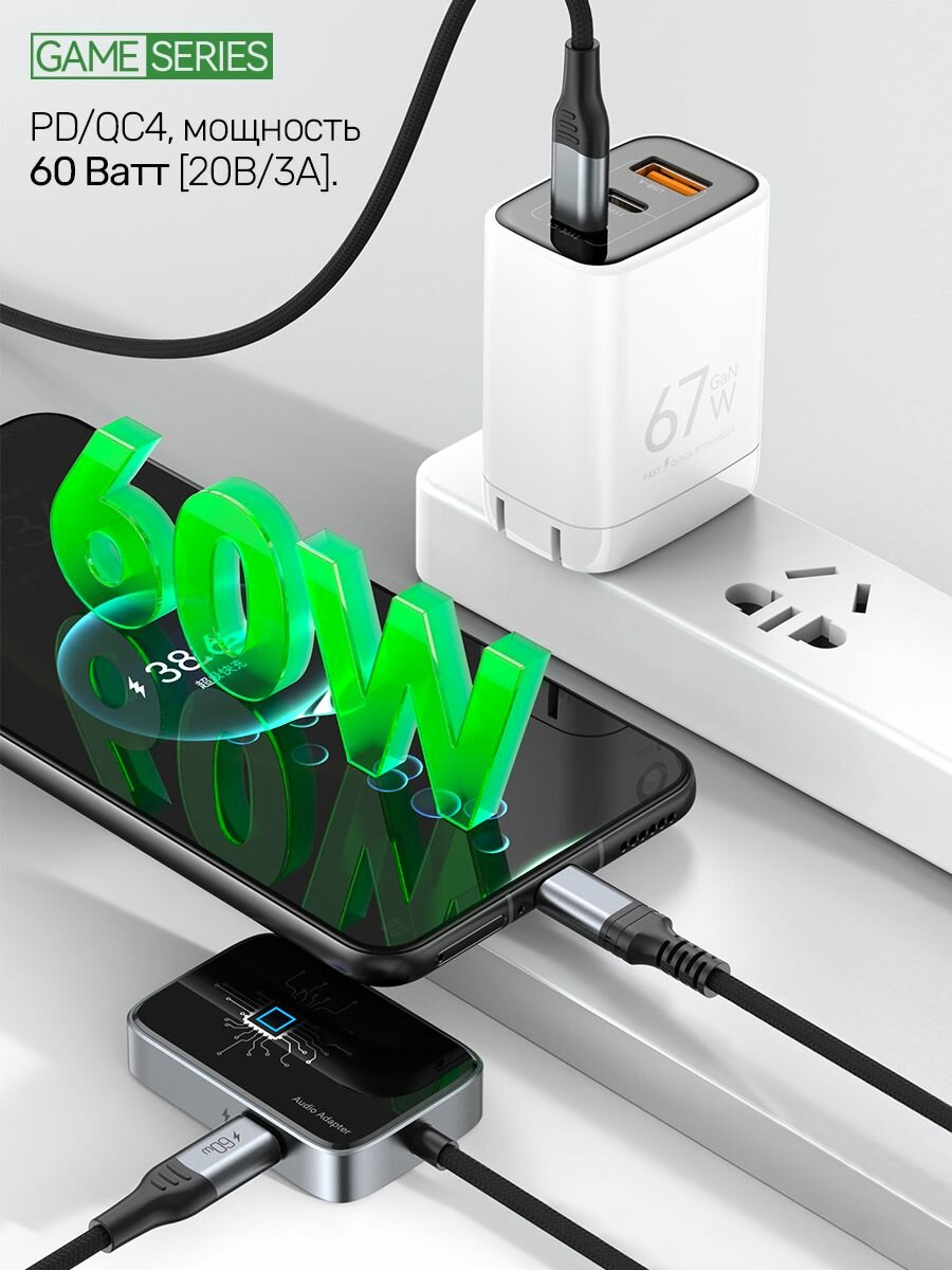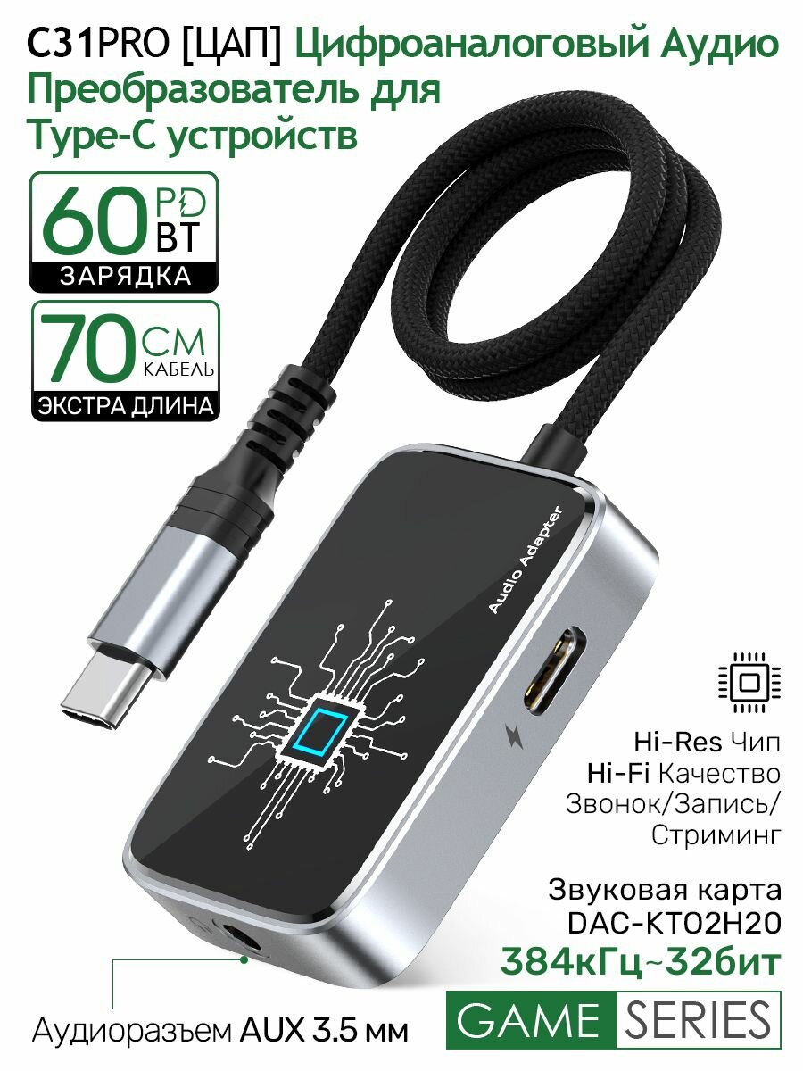 Цифроаналоговый аудио-конвертер ЦАП для Type-C устройств 2-в-1. Для наушников с разъемом Jack 3.5 мм и USB-C с поддержкой PD 60 Вт. Поддерживает разрешение 32 бит/384 кГц. Игровая звуковая карта с чипом KTO2H20. Адаптер с длинным кабелем 70 см, C31-Pro.: сравнение цен, характеристики, фото, актуальное наличие и цены.