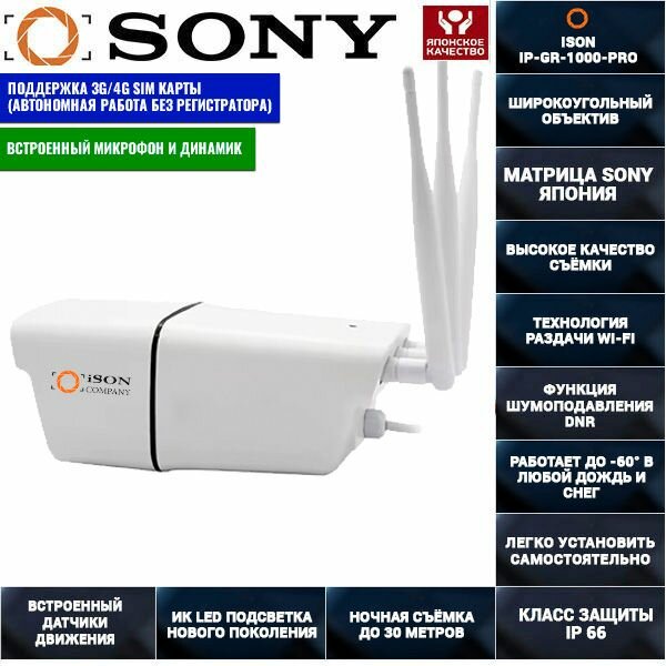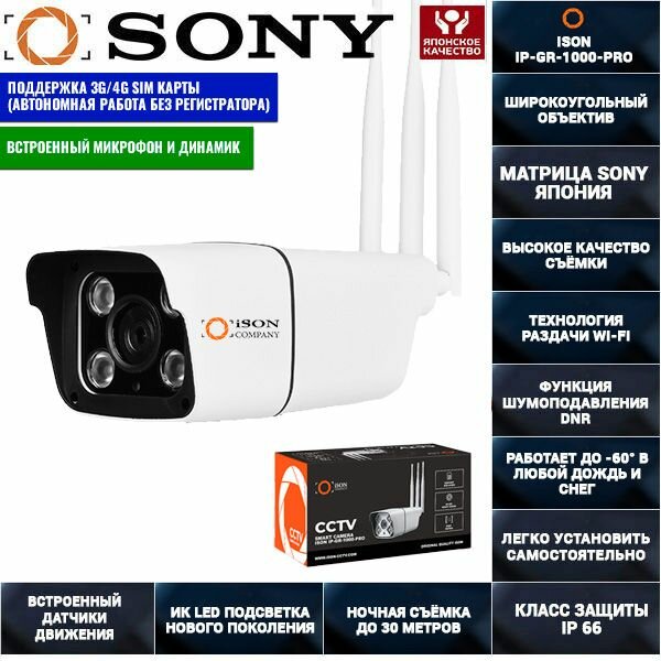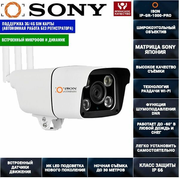Купить Цифровая беспроводная IP WI-Fi 4G GSM камера видеонаблюдения 5 мегапикселей ISON IP-GR-1000-PRO с доставкой по всей России.