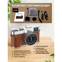 | Комплектация | 1 х цифровая камера 1 карта памяти 32 г 1 х кабель Type-C 1 х HDMI кабель 1 х Аккумулятор 1 х ремешок на запястье 1 х Руководство пользователя |