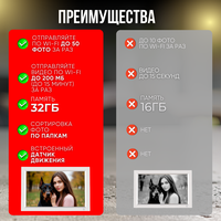 Цифровая фоторамка MEMORYFRAMES навсегда изменит то, как вы храните и демонстрируете любимые фото и видео. Преимущества нашей электронной фоторамки – бесплатная отправка с телефона по WiFi за раз 50 фотографий и длинных видеороликов до 200 Мб, возможность сортировки фоток по папкам и удаление их из рамки прямо с телефона, встроенный датчик движения. Будьте уверены, это лучший вариант среди всех фоторамок в продаже. Электронная рамка имеет большой сенсорный FULL HD IPS экран 15 дюймов с разрешением 1920*1080, встроенную память 32 Гб для хранения, есть разъем под флешку и карту micro SD, можно подключить через кабель type-c - USB компьютер. Есть календарь, будильник, погода, часы, режим слайд шоу с выбором времени и эффектов отображения, можно использовать как ночник. Музыкальная видеорамка на русском языке, имеет автоповорот экрана. Скачайте бесплатное мобильное приложение VPHOTO (еще больше возможностей, чем у Frameo) на телефон, введите код с интерактивной электро фоторамки и отправляйте по wifi контент, независимо от того, где находитесь. Отправляйте сразу на несколько мультирамок, делитесь кодом с близкими, чтобы они тоже отправляли свои снимки, накладывайте музыку на фото. Операционная система Android поддерживает большинство форматов: mp4, avi, png, jpeg, для аудио mp3. Забудьте о семейных фотоальбомах, создавайте необычный живой альбом на экране декоративной фоторамки. Цифровая рамка с вайфай позволит насладиться воспоминаниями, поделиться ими с семьей, передаст детали детских и свадебных слайдов, создаст атмосферу любви, превратив фотографии в настоящее произведение искусства, а красивый эстетичный дизайн впишется в интерьер, станет его украшением. Разнообразие функций делает белую видео рамку с часами на стену настолько универсальной, что она станет подарком и мужчине, и женщине. Новогодние праздники, свадьба детей, рождение малыша или самый обычный день останутся в сердце дольше, благодаря этой электронике. Упакована внутри в оригинальную подарочную коробку